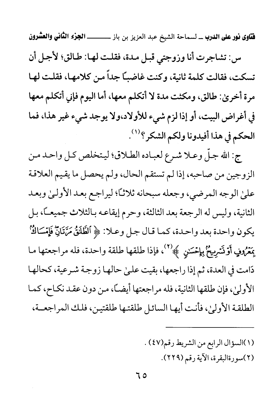 ج: الله جلّ وعلا شرع لعباده الطلاق؛ ليتخلص كل واحد من الزوجين من صاحبه، إذا لم تستقم الحال، ولم يحصل ما يقيم العلاقة على الوجه المرضي، وجعله سبحانه ثلاثًا؛ ليراجع بعد الأولى، وبعد الثانية، وليس له الرجعة بعد الثالثة، وحرم إيقاعه بالثلاث جميعًا، بل يكون واحدة بعد واحدة، كما قال جل وعلا: {الطَّلاقُ مَرَّتَانِ فَإِمْسَاكٌ بِمَعْرُوفٍ أَوْ تَسْرِيحٌ بِإِحْسَانٍ}، فإذا طلقها طلقة واحدة، فله مراجعتها ما دَامت في العدة، ثم إذا راجعها، بقيت على حالها زوجة شرعية، كحالها الأولى، فإن طلقها الثانية، فله مراجعتها أيضًا، من دون عقد نكاح، كما الطلقة الأولى، فأنت أيها السائل طلقتها طلقتين، فلك المراجعة،