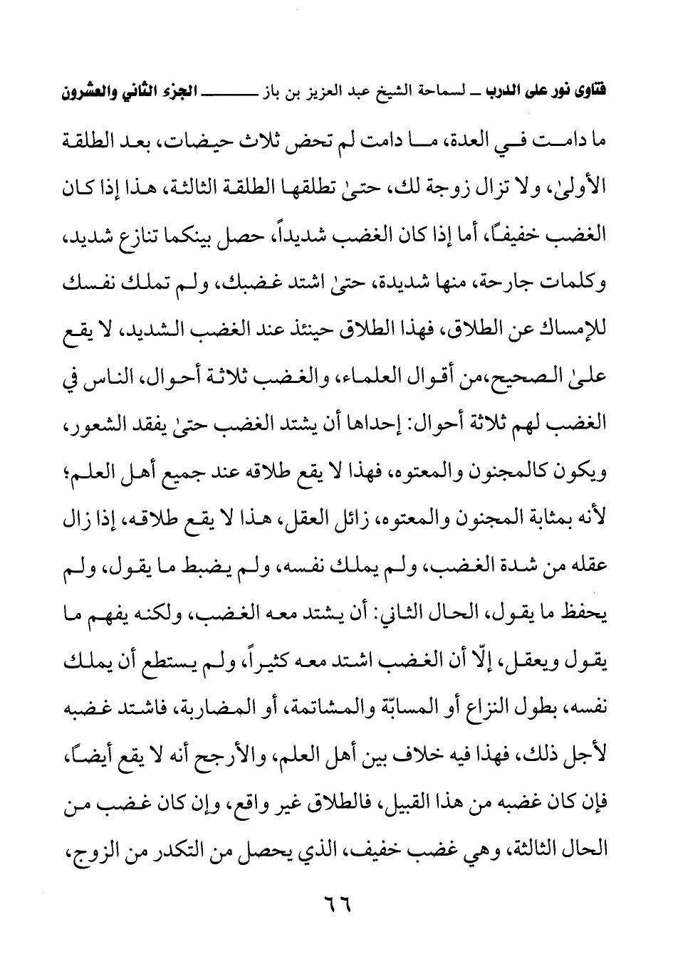 ما دامت في العدة، ما دامت لم تحض ثلاث حيضات، بعد الطلقة الأولى، ولا تزال زوجة لك، حتى تطلقها الطلقة الثالثة، هذا إذا كان الغضب خفيفًا، أما إذا كان الغضب شديدًا، حصل بينكما تنازع شديد، وكلمات جارحة، منها شديدة، حتى اشتد غضبك، ولم تملك نفسك للإمساك عن الطلاق، فهذا الطلاق حينئذ عند الغضب الشديد، لا يقع على الصحيح، من أقوال العلماء، والغضب ثلاثة أحوال، الناس في الغضب لهم ثلاثة أحوال: إحداها أن يشتد الغضب حتى يفقد الشعور، ويكون كالمجنون والمعتوه، فهذا لا يقع طلاقه عند جميع أهل العلم؛ لأنه بمثابة المجنون والمعتوه، زائل العقل، هذا لا يقع طلاقه، إذا زال عقله من شدة الغضب، ولم يملك نفسه، ولم يضبط ما يقول، ولم يحفظ ما يقول، الحال الثاني: أن يشتد معه الغضب، ولكنه يفهم ما يقول ويعقل، إلاّ أن الغضب اشتد معه كثيرًا، ولم يستطع أن يملك نفسه، بطول النزاع أو المسابّة والمشاتمة، أو المضاربة، فاشتد غضبه لأجل ذلك، فهذا فيه خلاف بين أهل العلم، والأرجح أنه لا يقع أيضًا، فإن كان غضبه من هذا القبيل، فالطلاق غير واقع، وإن كان غضب من الحال الثالثة، وهي غضب خفيف، الذي يحصل من التكدر من الزوج،
