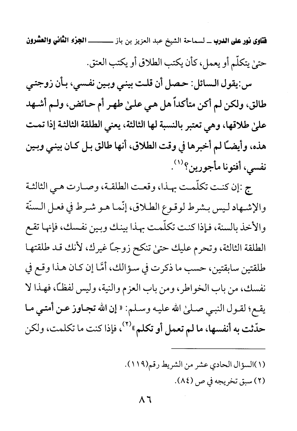 ج: إن كنت تكلّمت بهذا، وقعت الطلقة، وصارت هي الثالثة والإشهاد ليس بشرط لوقوع الطلاق، إنّما هو شرط في فعل السنّة والأخذ بالسنة، فإذا كنت تكلّمت بهذا بينك وبين نفسك، فإنها تقع الطلقة الثالثة، وتحرم عليك حتى تنكج زوجًا غيرك، لأنك قد طلقتها طلقتين سابقتين، حسب ما ذكرت في سؤالك، أمَّا إن كان هذا وقع في نفسك، من باب الخواطر، ومن باب العزم والنية، وليس لفظًا، فهذا لا يقع؛ لقول النبي صلى الله عليه وسلم: «إن الله تجاوز عن أمتي ما حدّثت به أنفسها، ما لم تعمل أو تكلم» (¬2) فإذا كنت ما تكلمت، ولكن