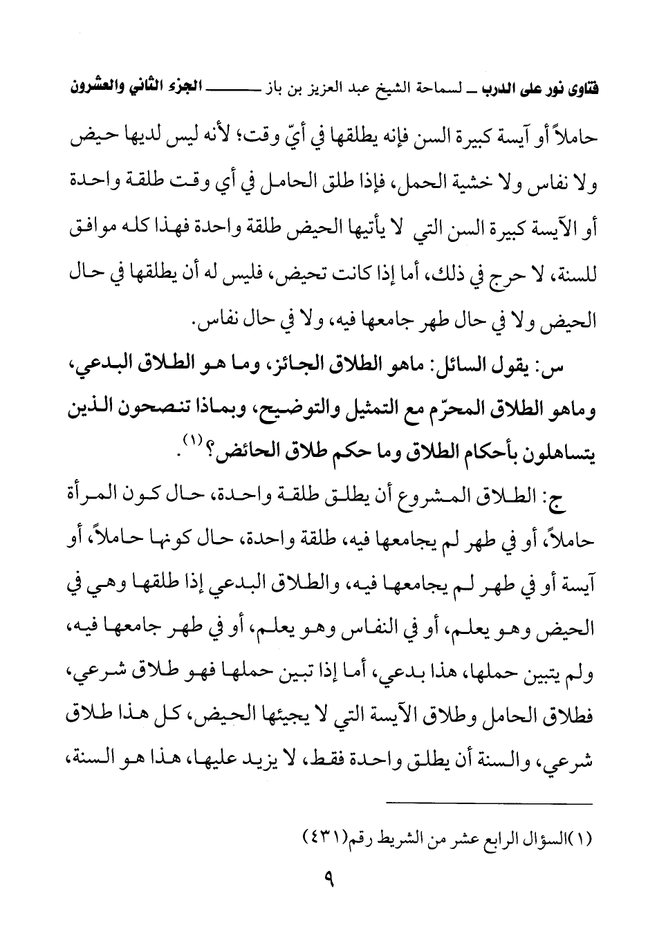 س: يقول السائل: ما هو الطلاق الجائز، وما هو الطلاق البدعي، وما هو الطلاق المحرّم مع التمثيل والتوضيح، وبماذا تنصحون الذين يتساهلون بأحكام الطلاق وما حكم طلاق الحائض؟ (¬1)