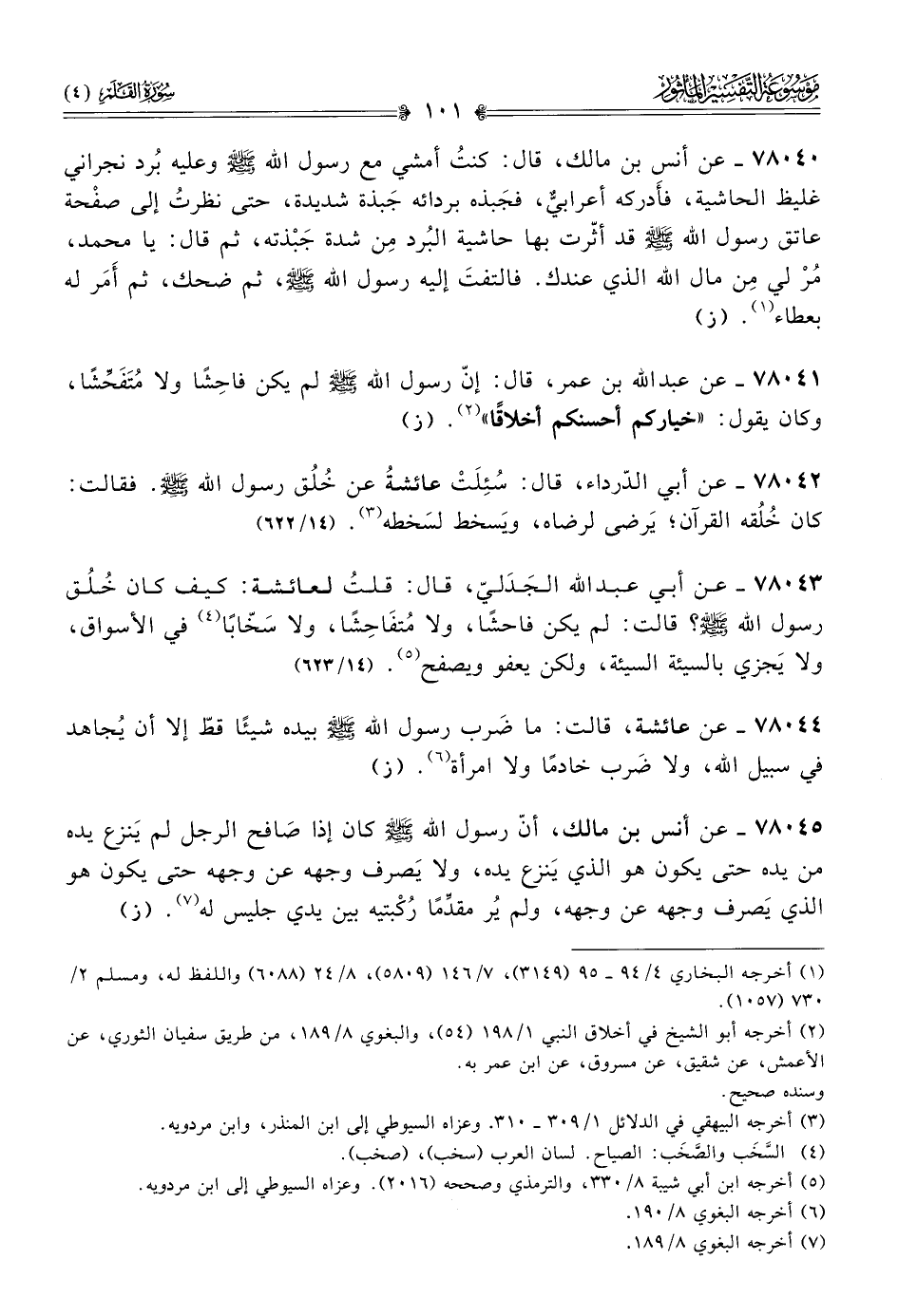 ٧٨٠٤٢ - عن أبي الدّرداء، قال: سُئِلَتْ عائشةُ عن خُلُق رسول الله - صلى الله عليه وسلم -. فقالت: كان خُلُقه القرآن؛ يَرضى لرضاه، ويَسخط لسَخطه (¬٣). (١٤/ ٦٢٢)