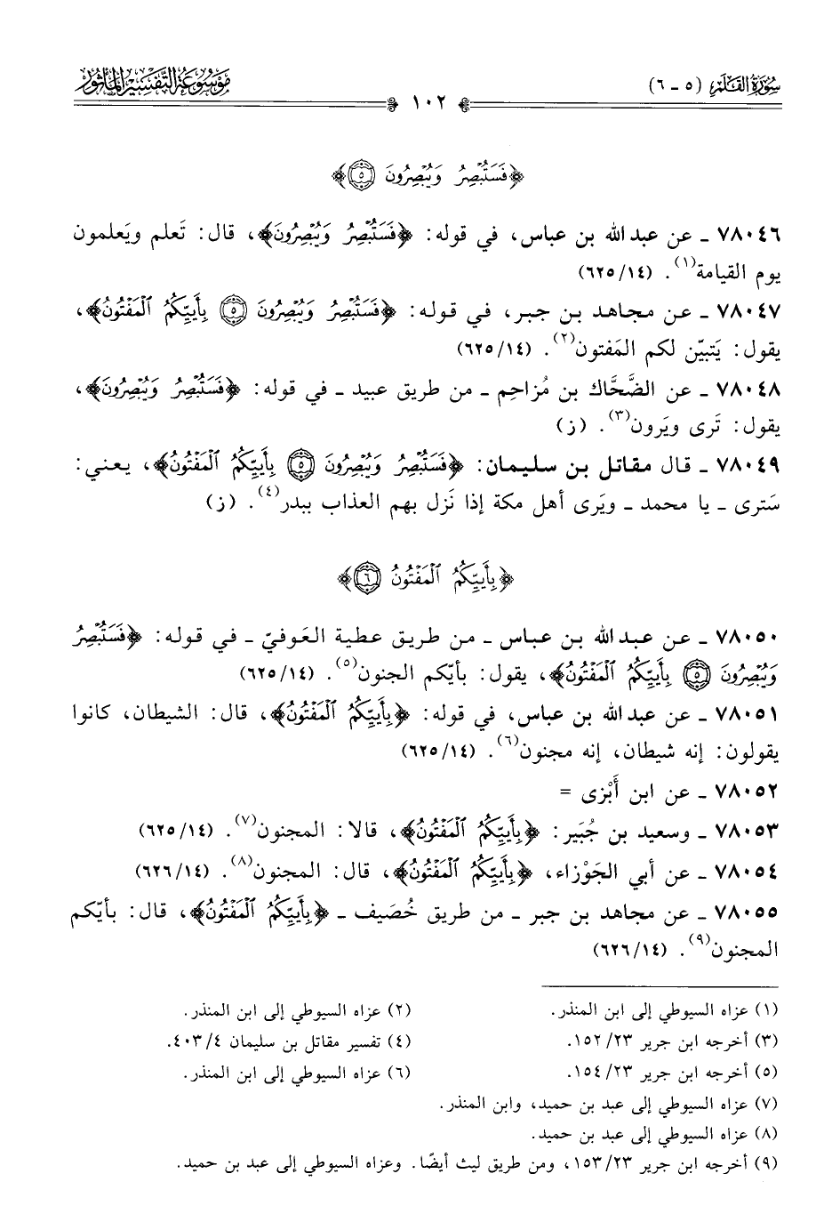 ٧٨٠٤٧ - عن مجاهد بن جبر، في قوله: {فَسَتُبْصِرُ ويُبْصِرُونَ * بِأَيِّكُمُ المَفْتُونُ}، يقول: يَتبيّن لكم المَفتون (¬٢). (١٤/ ٦٢٥)