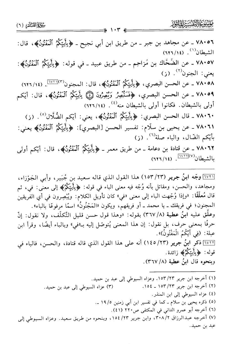 ٧٨٠٥٦ - عن مجاهد بن جبر -من طريق ابن أبي نجيح- {بِأَيِّكُمُ المَفْتُونُ}، قال: الشيطان (¬١). (١٤/ ٦٢٦)