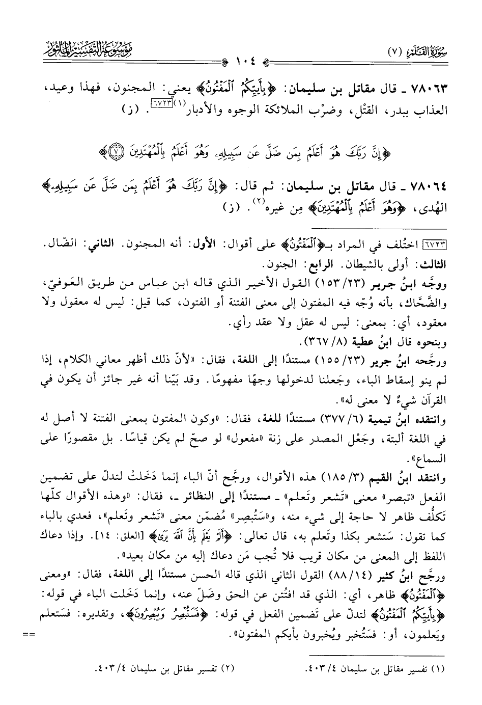 ورجَّح ابنُ كثير (١٤/ ٨٨) القول الثاني الذي قاله الحسن مستندًا إلى اللغة، فقال: «ومعنى {المفتون} ظاهر، أي: الذي قد افتُتن عن الحق وضَلّ عنه، وإنما دَخَلت الباء في قوله: {بأييكم المفتون} لتدلّ على تَضمين الفعل في قوله: {فستبصر ويبصرون}، وتقديره: فسَتعلم ويَعلمون، أو: فسَتُخبر ويُخبرون بأيكم المفتون».
