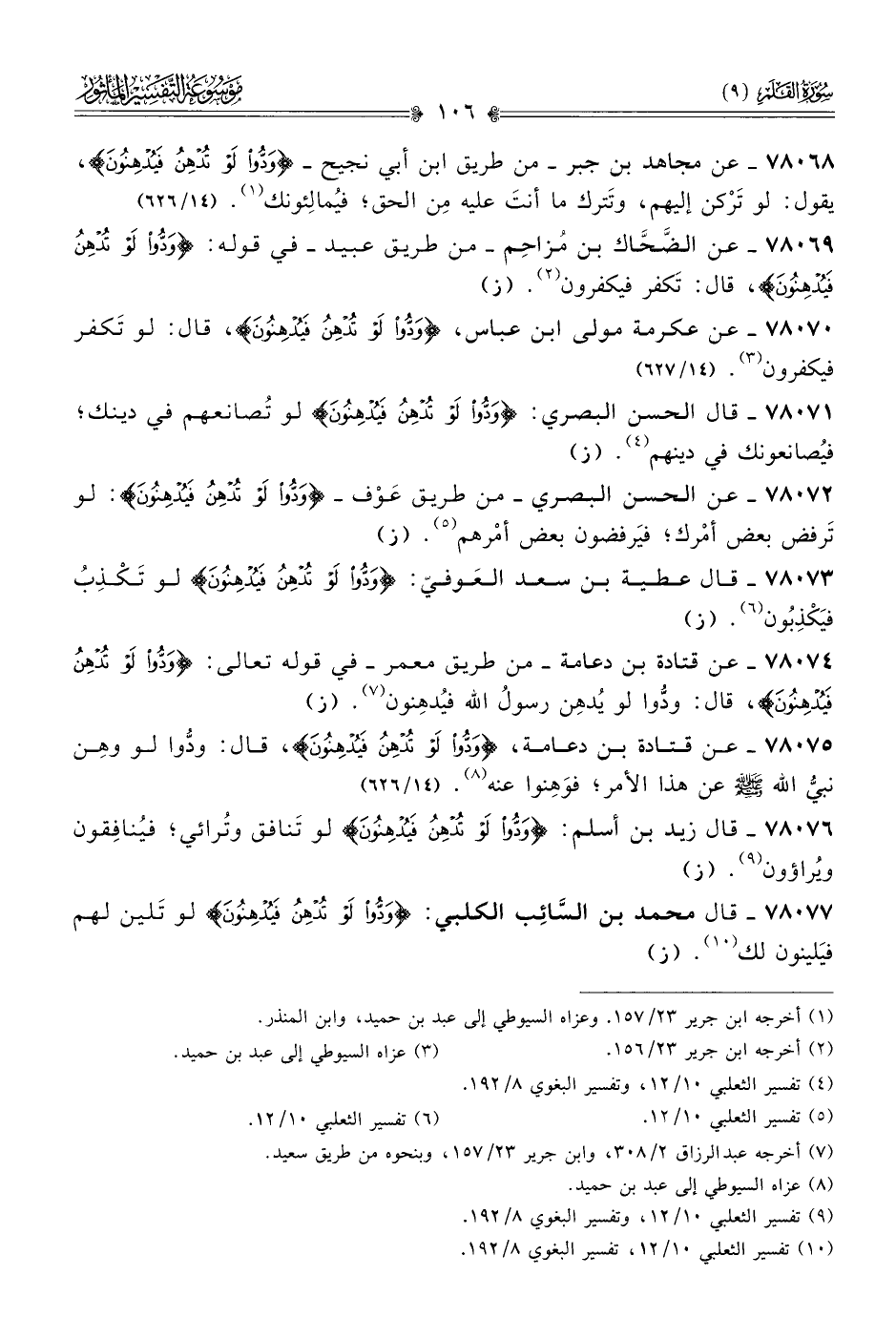 ٧٨٠٦٨ - عن مجاهد بن جبر -من طريق ابن أبي نجيح- {ودُّوا لَوْ تُدْهِنُ فَيُدْهِنُونَ}، يقول: لو تَرْكن إليهم، وتَترك ما أنتَ عليه مِن الحق؛ فيُمالِئونك (¬١). (١٤/ ٦٢٦)
