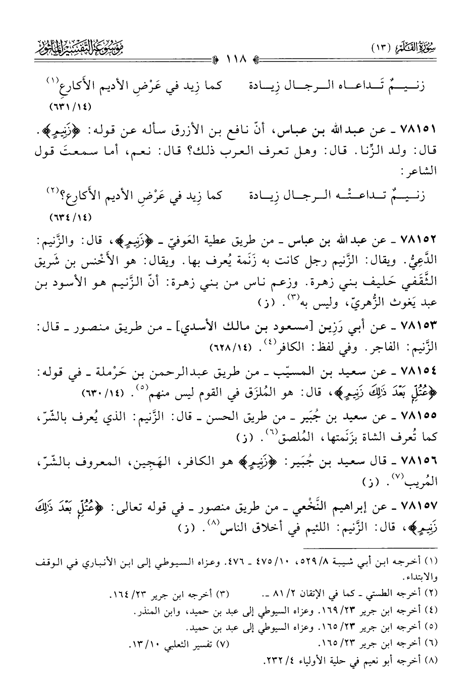 ٧٨١٥٦ - قال سعيد بن جُبَير: {زَنِيمٍ} هو الكافر، الهَجِين، المعروف بالشّرّ، المُريب (¬٧). (ز)