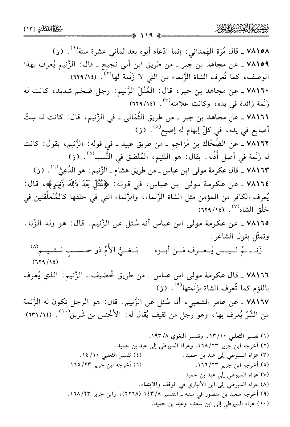 ٧٨١٦٧ - عن عامر الشعبي، أنه سُئل عن الزَّنيم. قال: هو الرجل تكون له الزَّنمة من الشّرّ يُعرف بها، وهو رجل من ثقيف يُقال له: الأَخْنس بن شَريق (¬١٠). (١٤/ ٦٣١)