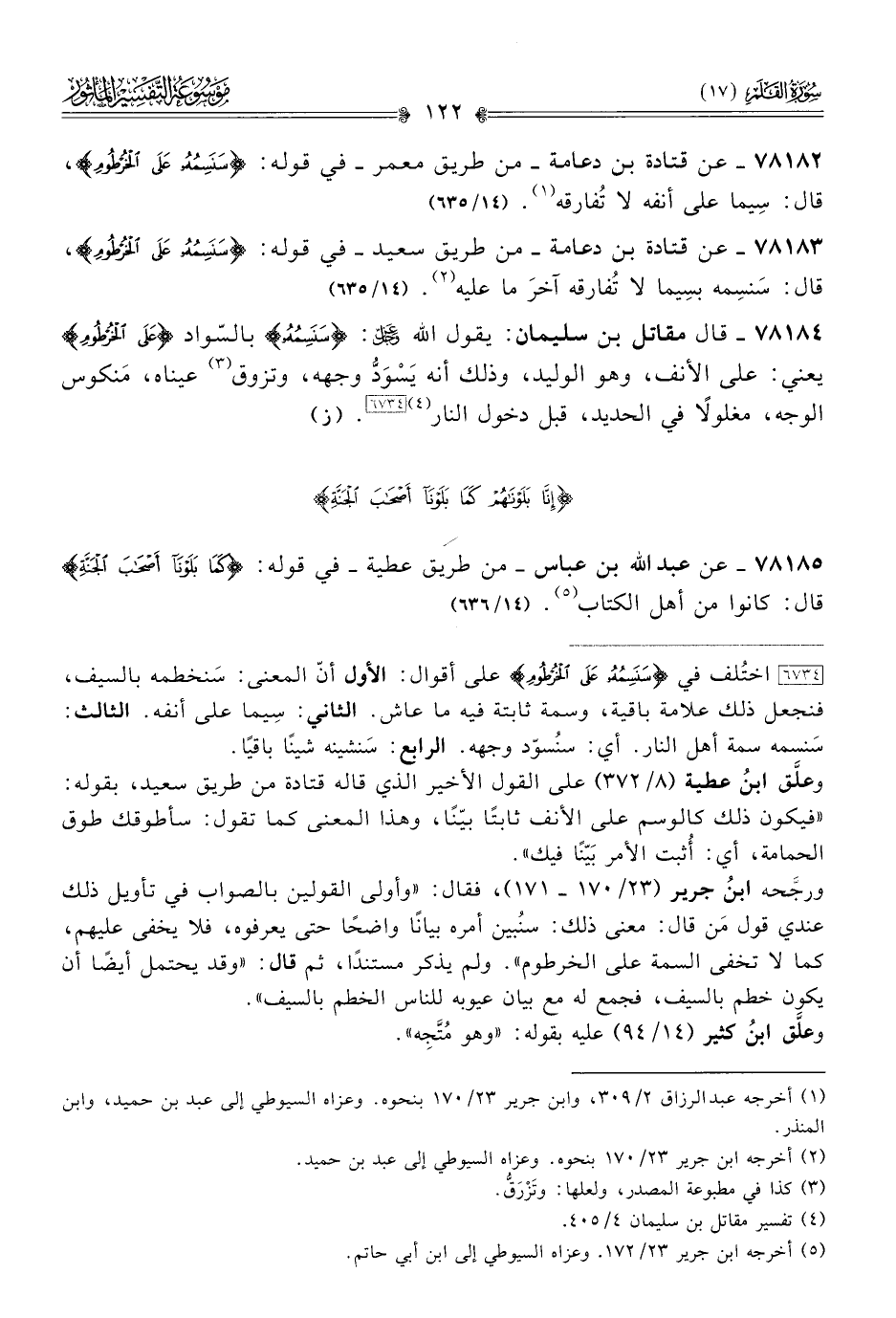 ٧٨١٨٣ - عن قتادة بن دعامة -من طريق سعيد- في قوله: {سَنَسِمُهُ عَلى الخُرْطُومِ}، قال: سَنسِمه بسِيما لا تُفارقه آخرَ ما عليه (¬٢). (١٤/ ٦٣٥)