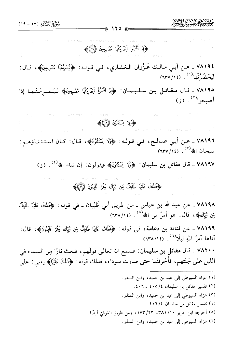 ٧٨١٩٥ - قال مقاتل بن سليمان: {إذْ أقْسَمُوا لَيَصْرِمُنَّها مُصْبِحِينَ} ليَصرِمُنّها إذا أصبحوا (¬٢). (ز)