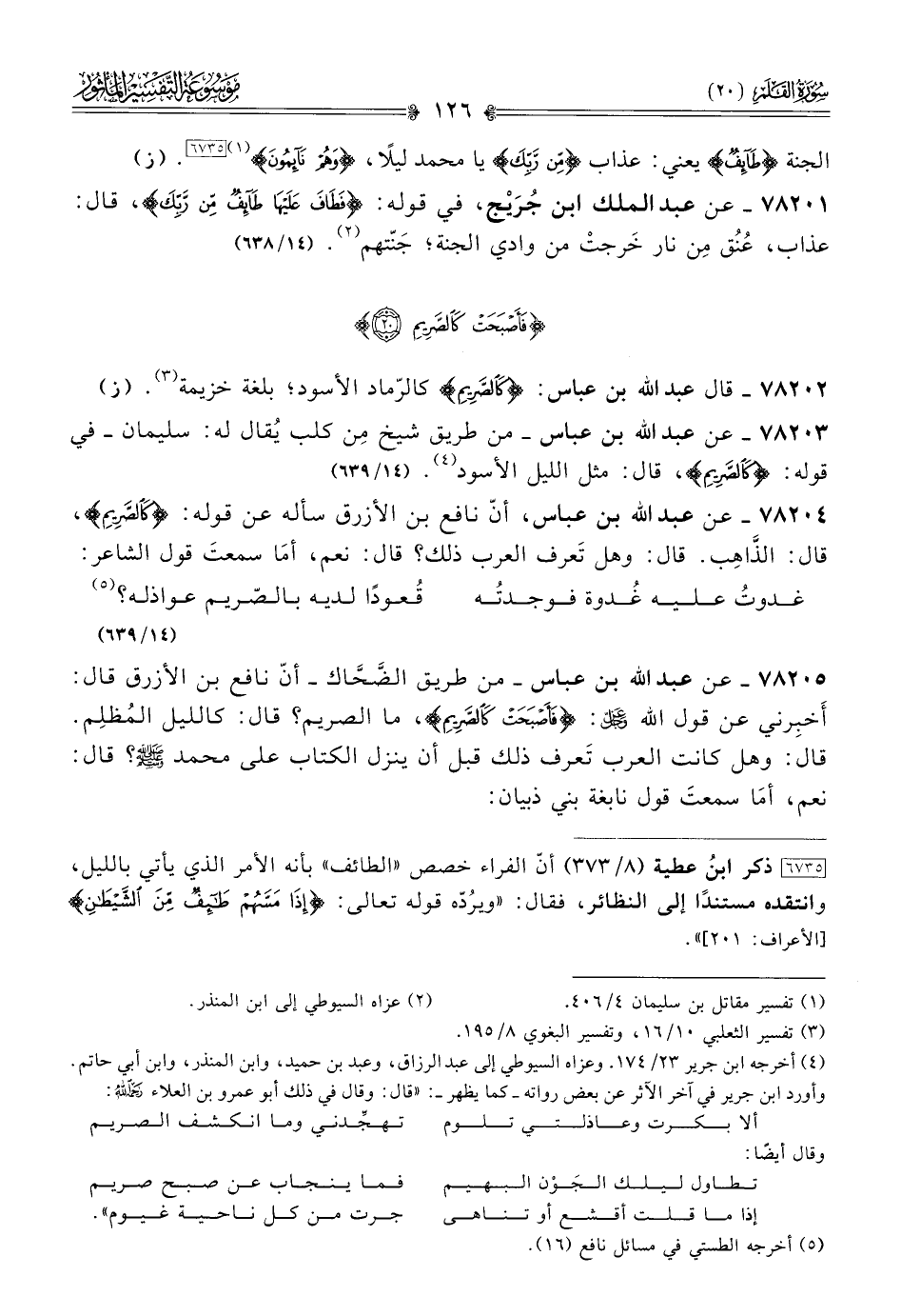 ٧٨٢٠٤ - عن عبد الله بن عباس، أنّ نافع بن الأزرق سأله عن قوله: {كالصَّرِيمِ}، قال: الذّاهِب. قال: وهل تَعرف العرب ذلك؟ قال: نعم، أما سمعتَ قول الشاعر: