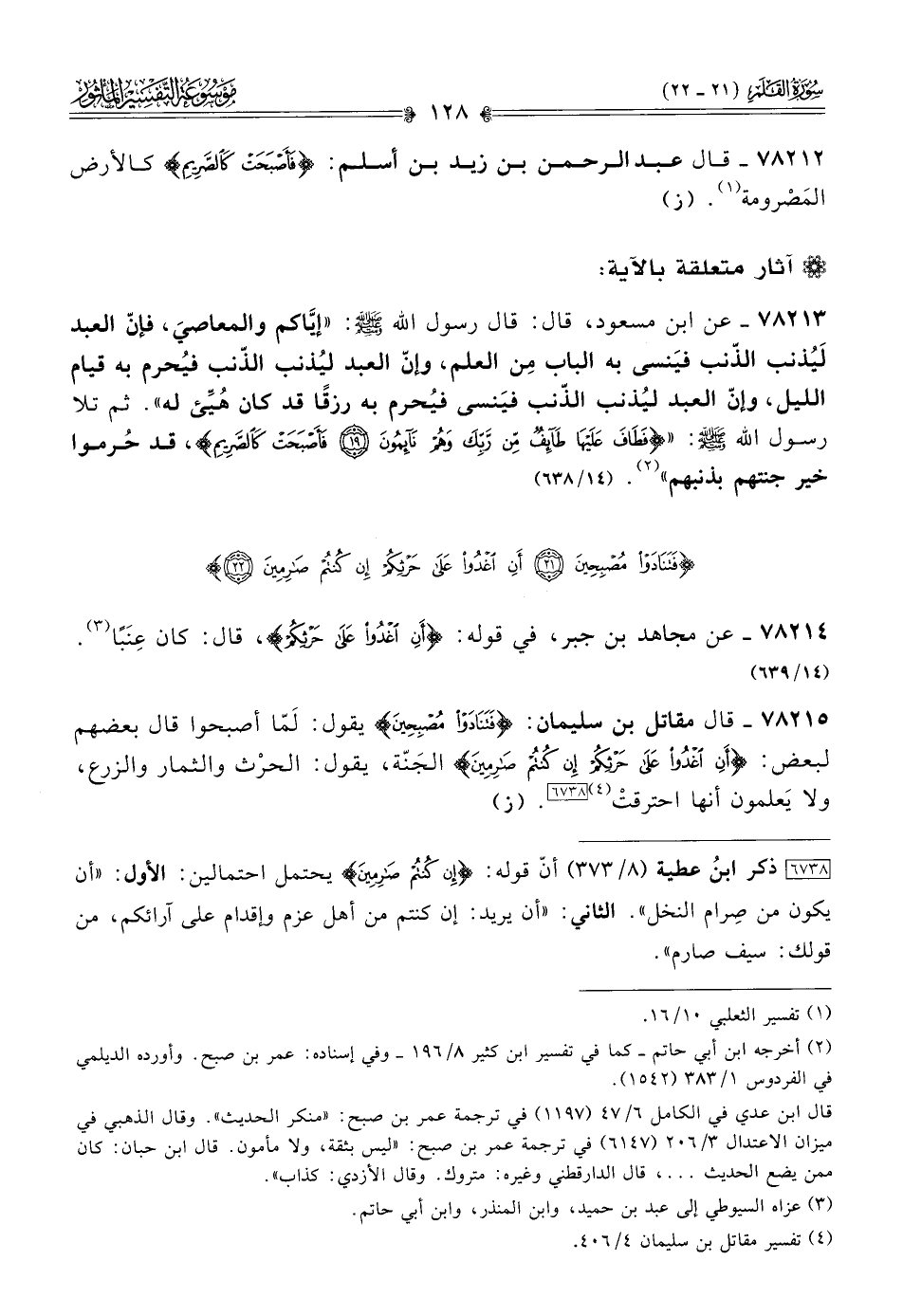 ٧٨٢١٢ - قال عبد الرحمن بن زيد بن أسلم: {فَأَصْبَحَتْ كالصَّرِيمِ} كالأرض المَصْرومة (¬١). (ز)