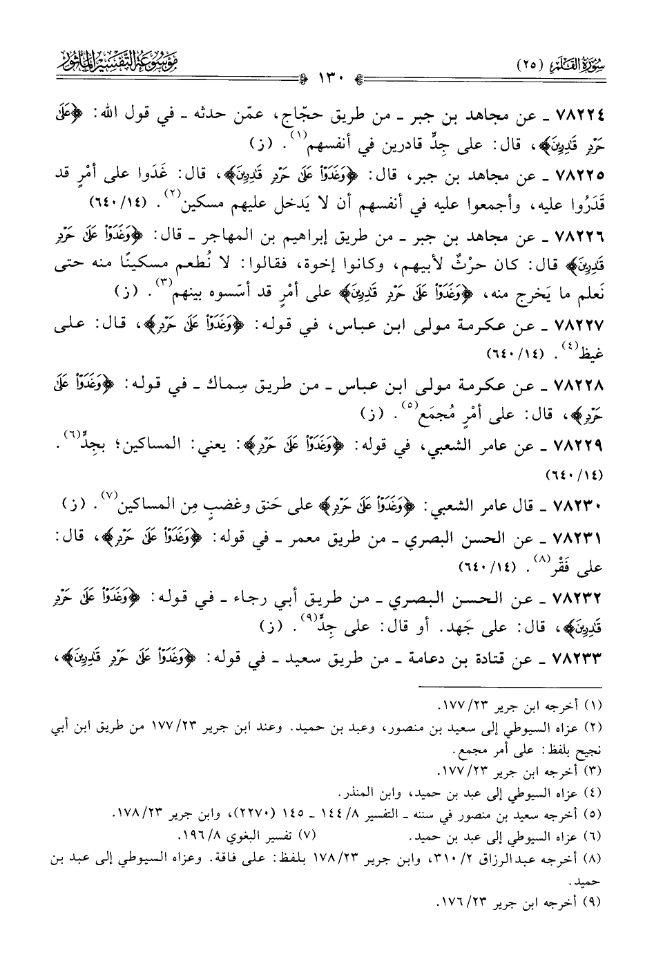 ٧٨٢٢٤ - عن مجاهد بن جبر -من طريق حجّاج، عمّن حدثه- في قول الله: {على حرد قادرين}، قال: على جِدٍّ قادرين في أنفسهم (¬١). (ز)