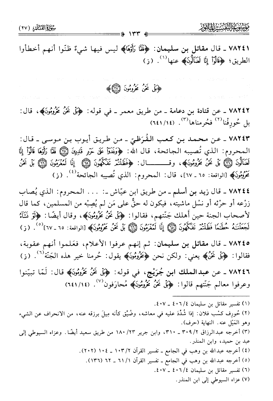 ٧٨٢٤٢ - عن قتادة بن دعامة -من طريق معمر- في قوله: {بَلْ نَحْنُ مَحْرُومُونَ}، قال: بل حُورِفْنا (¬٢) فحُرمناها (¬٣). (١٤/ ٦٤١)