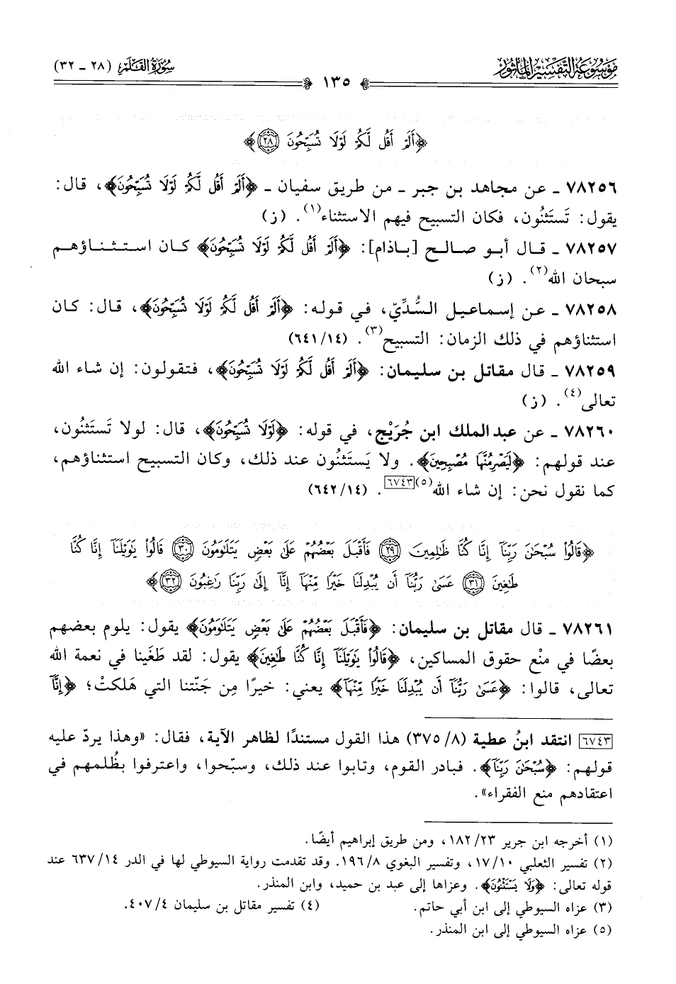 ٧٨٢٦٠ - عن عبد الملك ابن جُرَيْج، في قوله: {لَوْلا تُسَبِّحُونَ}، قال: لولا تَستَثنُون، عند قولهم: {ليَصْرِمُنّها مُصبحين}. ولا يَستَثنُون عند ذلك، وكان التسبيح استثناؤهم، كما نقول نحن: إن شاء الله (¬٥) [٦٧٤٣]. (١٤/ ٦٤٢)