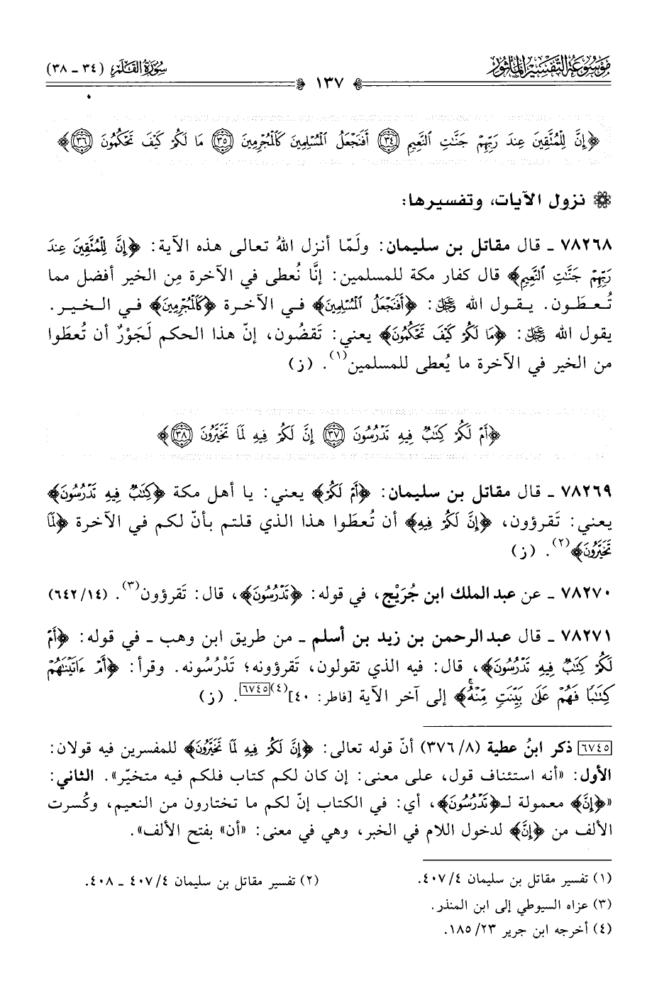 ٧٨٢٧١ - قال عبد الرحمن بن زيد بن أسلم -من طريق ابن وهب- في قوله: {أمْ لَكُمْ كِتابٌ فِيهِ تَدْرُسُونَ}، قال: فيه الذي تقولون، تَقرؤونه؛ تَدْرُسُونه. وقرأ: {أمْ آتَيْناهُمْ كِتابًا فَهُمْ عَلى بَيِّنَتٍ مِنهُ} إلى آخر الآية [فاطر: ٤٠] (¬٤) [٦٧٤٥]. (ز)