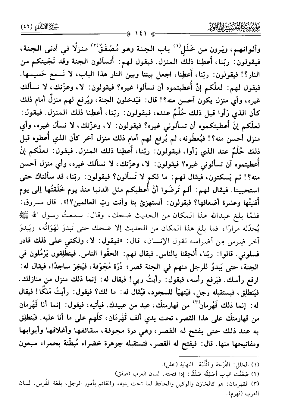 وألوانهم، ويَرون من خَلَلِ (¬١) باب الجنة وهو مُصْفَقٌ (¬٢) منزلًا في أدنى الجنة، فيقولون: ربّنا، أعطِنا ذلك المنزل. فيقول لهم: أتسألون الجنة وقد نَجّيتكم من النار؟! فيقولون: ربّنا، أعطِنا، اجعل بيننا وبين النار هذا الباب، لا نَسمع حَسيسها. فيقول لهم: لعلّكم إنْ أُعطيتموه أن تسألوا غيره؟ فيقولون: لا، وعزّتك، لا نسألك غيره، وأي منزل يكون أحسن منه؟! قال: فيَدخلون الجنة، ويُرفع لهم منزلٌ أمام ذلك كأن الذي رَأوا قبل ذلك حُلْمٌ عنده، فيقولون: ربّنا، أعطِنا ذلك المنزل. فيقول: لعلّكم إنْ أعطيتكموه أن تسألوني غيره؟ فيقولون: لا، وعزّتك، لا نسأل غيره، وأي منزل أحسن منه؟! فيُعطَونه، ثم يُرفع لهم أمام ذلك منزل آخر كأن الذي أُعطوه قبل ذلك حُلْمٌ عند الذي رَأوا، فيقولون: ربّنا، أعطِنا ذلك المنزل. فيقول: لعلّكم إنْ أُعطيتموه أن تسألوني غيره؟ فيقولون: لا، وعزّتك، لا نسألك غيره، وأي منزل أحسن منه؟! ثم يَسكتون، فيقال لهم: ما لكم لا تَسألون؟ فيقولون: ربّنا، قد سألناك حتى استحيينا. فيقال لهم: ألم تَرضَوا أنْ أُعطيكم مثل الدنيا منذ يوم خَلَقتُها إلى يوم أفنيتُها وعشرة أضعافها؟ فيقولون: أتستهزئ بنا وأنت ربّ العالمين؟!». قال مسروق: فلمّا بلغ عبد الله هذا المكان من الحديث ضحك، وقال: سمعتُ رسول الله - صلى الله عليه وسلم - يُحدّثه مرارًا، فما بلغ هذا المكان من الحديث إلا ضحك حتى تَبدوَ لهَواتُه، ويَبدوَ آخر ضِرس مِن أضراسه لقول الإنسان، قال: «فيقول: لا، ولكني على ذلك قادر فسلوني. قالوا: ربّنا، ألحِقنا بالناس. فيقال لهم: الحقُوا الناس. فينطَلِقون يَرْمُلون في الجنة، حتى يَبدوُ للرجل منهم في الجنة قصر؛ دُرّة مُجَوّفة، فيَخِرّ ساجدًا، فيقال له: ارفع رأسك. فيَرفع رأسه، فيقول: رأيتُ ربي! فيقال له: إنما ذلك منزل من منازلك. فيَنطلِق، فيستقبله رجل، فيَتهيّأ للسجود، فيُقال له: ما لك؟ فيقول: رأيتُ مَلكًا! فيقال له: إنما ذلك قَهْرمان (¬٣) من قهارمتكَ، عبد من عبيدك. فيأتيه، فيقول: إنما أنا قَهْرمان من قهارمتكَ على هذا القصر، تحت يدي ألف قَهْرمان، كلّهم على ما أنا عليه. فيَنطلِق به عند ذلك حتى يفتح له القصر، وهي درة مجوفة، سقائفها وأغلاقها وأبوابها ومفاتيحها منها. قال: فيفتح له القصر، فتستقبله جوهرة خضراء مُبطّنة بحمراء سبعون