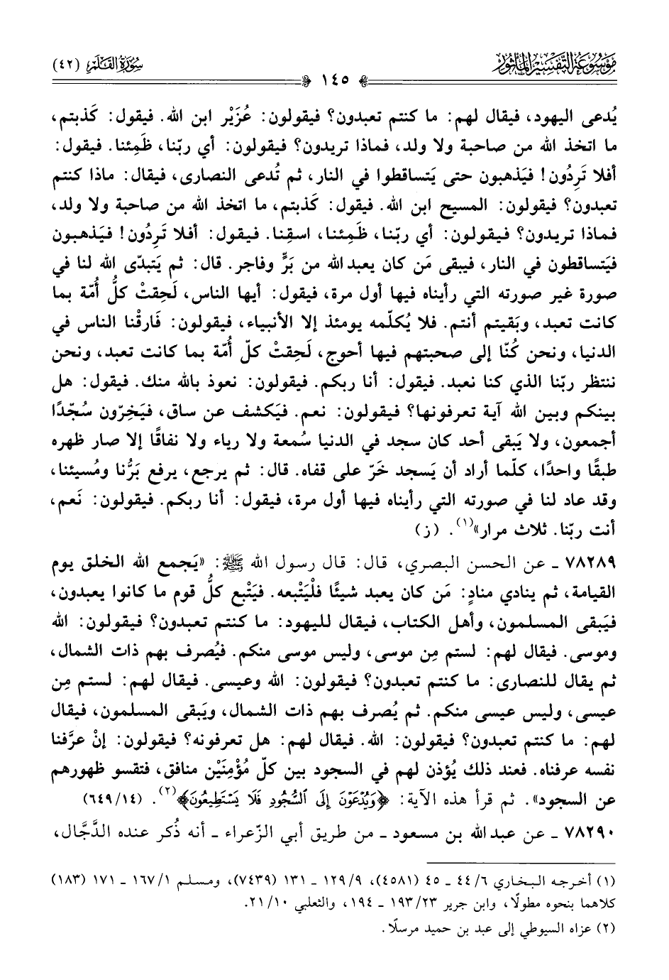 ٧٨٢٨٩ - عن الحسن البصري، قال: قال رسول الله - صلى الله عليه وسلم -: «يَجمع الله الخلق يوم القيامة، ثم ينادي منادٍ: مَن كان يعبد شيئًا فلْيَتْبعه. فيَتْبع كلُّ قوم ما كانوا يعبدون، فيَبقى المسلمون، وأهل الكتاب، فيقال لليهود: ما كنتم تعبدون؟ فيقولون: الله وموسى. فيقال لهم: لستم مِن موسى، وليس موسى منكم. فيُصرف بهم ذات الشمال، ثم يقال للنصارى: ما كنتم تعبدون؟ فيقولون: الله وعيسى. فيقال لهم: لستم مِن عيسى، وليس عيسى منكم. ثم يُصرف بهم ذات الشمال، ويَبقى المسلمون، فيقال لهم: ما كنتم تعبدون؟ فيقولون: الله. فيقال لهم: هل تعرفونه؟ فيقولون: إنْ عرفنا نفسه عرّفناه. فعند ذلك يُؤذن لهم في السجود بين كلّ مُؤْمِنَيْن منافق، فتقسو ظهورهم عن السجود». ثم قرأ هذه الآية: {ويُدْعَوْنَ إلى السُّجُودِ فَلا يَسْتَطِيعُونَ} (¬٢). (١٤/ ٦٤٩)