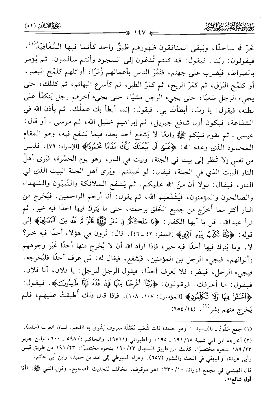 خَرّ لله ساجدًا، ويَبقى المنافقون ظهورهم طَبقٌ واحد كأنما فيها السَّفافِيدُ (¬١)، فيقولون: ربّنا. فيقول: قد كنتم تُدعَون إلى السجود وأنتم سالمون. ثم يُؤمر بالصراط، فيُضرب على جهنم، فتَمُرّ الناس بأعمالهم زُمَرًا؛ أوائلهم كلمْح البصر، أو كلمْح البَرْق، ثم كمَرّ الريح، ثم كمَرّ الطير، ثم كأسرع البهائم، ثم كذلك، حتى يجيء الرجل سَعيًا، حتى يجيء الرجل مشيًا، حتى يجيء آخرهم رجل يَتكفّأ على بطنه، فيقول: يا ربّ، أبطأتَ بي. فيقول: إنما أبطأ بك عملُك. ثم يأذن الله في الشفاعة، فيكون أول شافع جبريل، ثم إبراهيم خليل الله، ثم موسى -أو قال: عيسى- ثم يقوم نبيّكم - صلى الله عليه وسلم - رابعًا لا يَشفع أحد بعده فيما يَشفع فيه، وهو المقام المحمود الذي وعده الله: {عَسى أنْ يَبْعَثَكَ رَبُّكَ مَقامًا مَحْمُودًا} [الإسراء: ٧٩]. فليس من نفسٍ إلا تَنظر إلى بيت في الجنة، وبيت في النار، وهو يوم الحسْرة، فيَرى أهلُ النار البيت الذي في الجنة، فيقال: لو عَمِلتم. ويَرى أهل الجنة البيت الذي في النار، فيقال: لولا أن منّ الله عليكم. ثم يَشفع الملائكة والنّبيّون والشهداء والصالحون والمؤمنون، فيُشَفّعهم الله، ثم يقول: أنا أرحم الراحمين. فيُخرج من النار أكثر مما أخرَج من جميع الخَلْق برحمته، حتى ما يَترك فيها أحدًا فيه خير. ثم قرأ عبد الله: قل يا أيها الكفار: {ما سَلَكَكُمْ فِي سَقَرَ قالُوا لَمْ نَكُ مِنَ المُصَلِّينَ} إلى قوله: {وكُنّا نُكَذِّبُ بِيَوْمِ الدِّينِ} [المدثر: ٤٢ - ٤٦]. قال: تَرون في هؤلاء أحدًا فيه خير؟ لا، وما يَترك فيها أحدًا فيه خير، فإذا أراد الله أن لا يُخرج منها أحدًا غَيّر وجوههم وألوانهم، فيجيء الرجل مِن المؤمنين، فيَشفع، فيقال له: مَن عرف أحدًا فليُخرجه. فيجيء الرجل، فينظر، فلا يَعرف أحدًا، فيقول الرجل للرجل: يا فلان، أنا فلان. فيقول: ما أعرفك. فيقولون: {رَبَّنا أخْرِجْنا مِنها فَإنْ عُدْنا فَإنّا ظالِمُونَ}. فيقول: {اخْسَئُوا فِيها ولا تُكَلِّمُونِ} [المؤمنون: ١٠٧، ١٠٨]. فإذا قال ذلك أُطبقتْ عليهم، فلم يَخرج منهم بشر (¬٢). (١٤/ ٦٥٤)