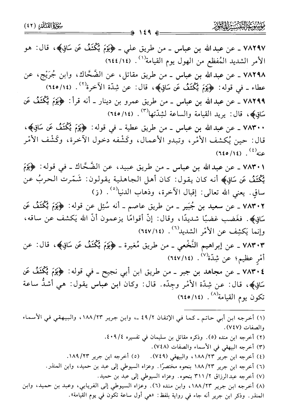 ٧٨٢٩٩ - عن عبد الله بن عباس -من طريق عمرو بن دينار- أنه قرأ: {يَوْمَ يُكْشَفُ عَنْ ساقٍ}، قال: يريد القيامة والساعة لشِدّتها (¬٣). (١٤/ ٦٤٥)
