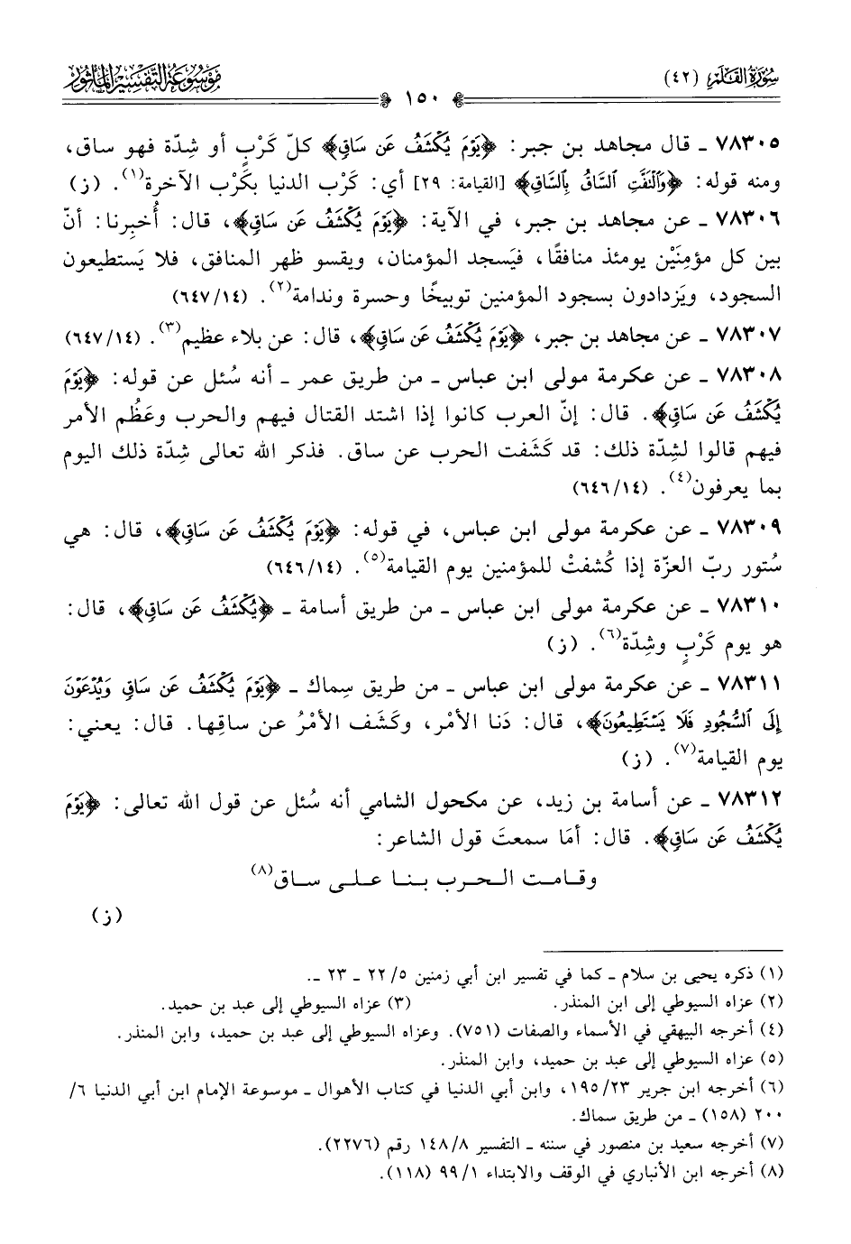 ٧٨٣٠٨ - عن عكرمة مولى ابن عباس -من طريق عمر- أنه سُئل عن قوله: {يَوْمَ يُكْشَفُ عَنْ ساقٍ}. قال: إنّ العرب كانوا إذا اشتد القتال فيهم والحرب وعَظُم الأمر فيهم قالوا لشِدّة ذلك: قد كَشَفت الحرب عن ساق. فذكر الله تعالى شِدّة ذلك اليوم بما يعرفون (¬٤). (١٤/ ٦٤٦)