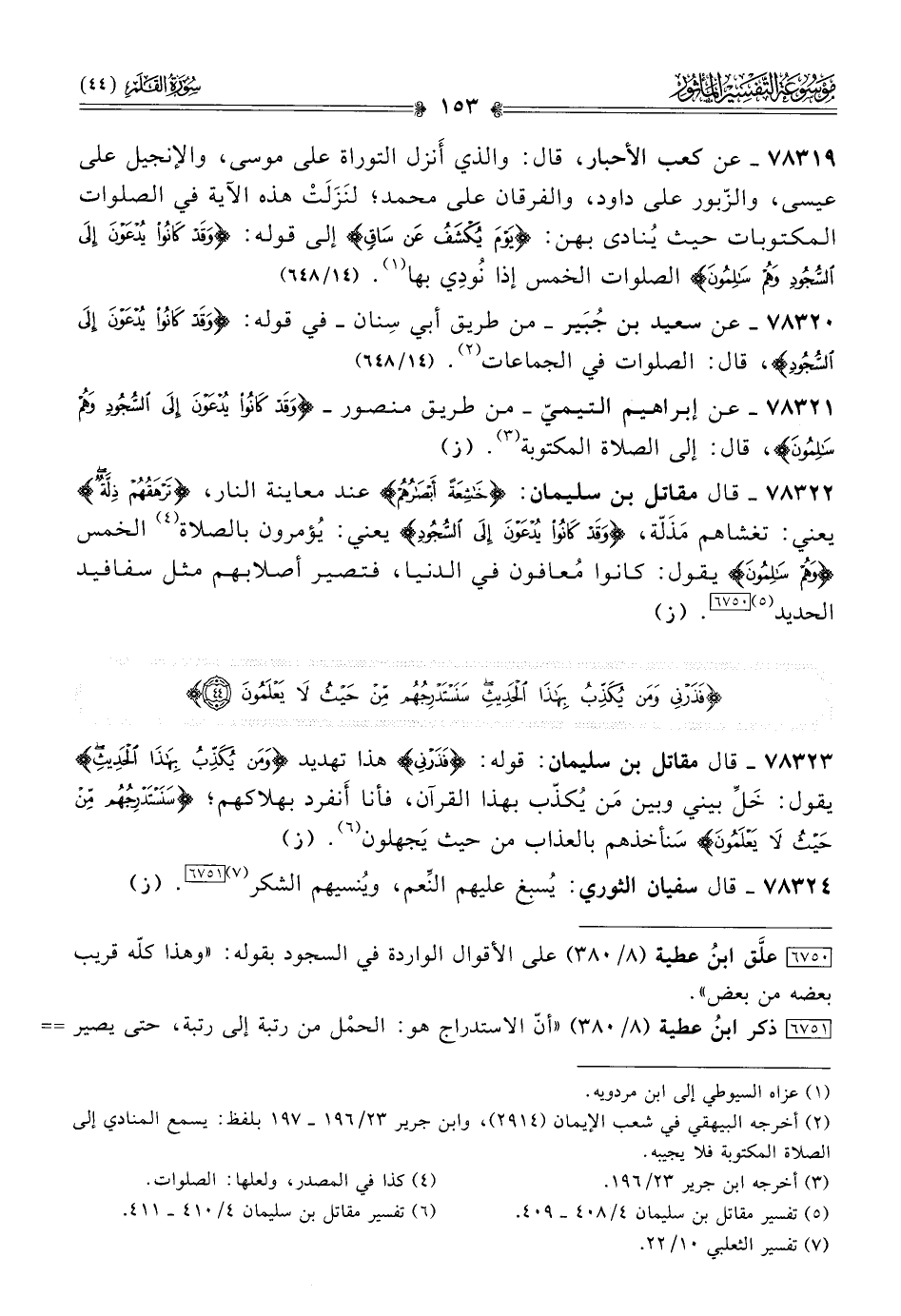 ٧٨٣١٩ - عن كعب الأحبار، قال: والذي أنزل التوراة على موسى، والإنجيل على عيسى، والزّبور على داود، والفرقان على محمد؛ لنَزَلَتْ هذه الآية في الصلوات المكتوبات حيث يُنادى بهن: {يَوْمَ يُكْشَفُ عَنْ ساقٍ} إلى قوله: {وقَدْ كانُوا يُدْعَوْنَ إلى السُّجُودِ وهُمْ سالِمُونَ} الصلوات الخمس إذا نُودِي بها (¬١). (١٤/ ٦٤٨)