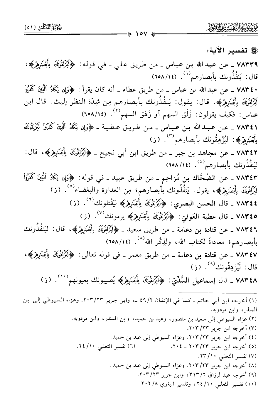 ٧٨٣٤٥ - قال عطية العَوفيّ: {لَيُزْلِقُونَكَ بِأَبْصارِهِمْ} يرمونك (¬٧). (ز)