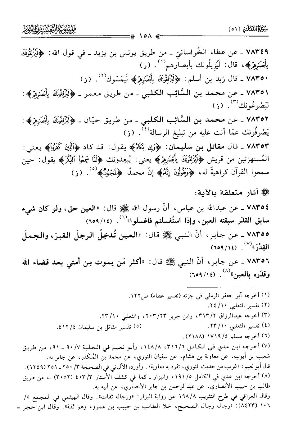 ٧٨٣٥٠ - قال زيد بن أسلم: {لَيُزْلِقُونَكَ بِأَبْصارِهِمْ} لَيمَسّوك (¬٢). (ز)