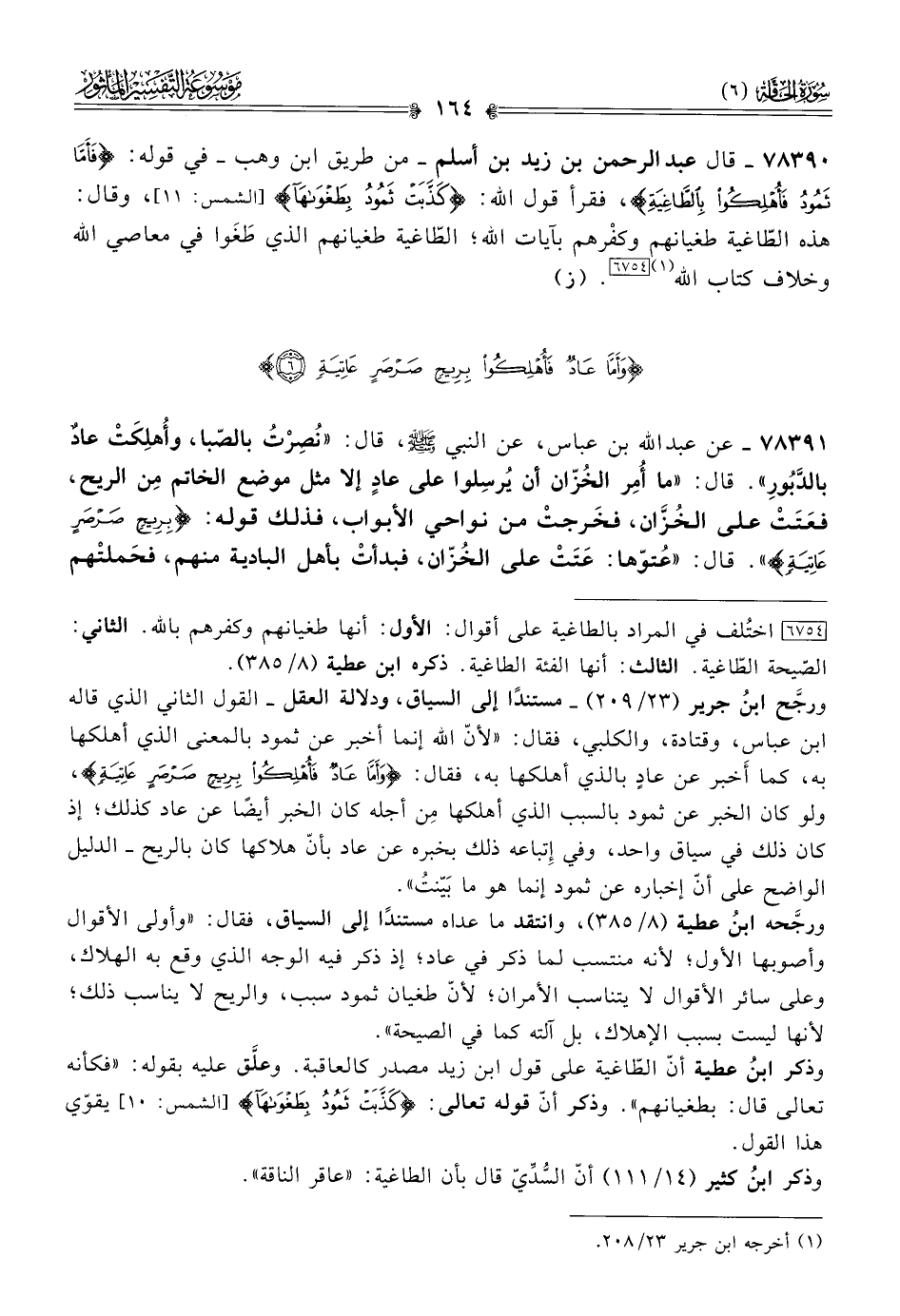 ٧٨٣٩٠ - قال عبد الرحمن بن زيد بن أسلم -من طريق ابن وهب- في قوله: {فَأَمّا ثَمُودُ فَأُهْلِكُوا بِالطّاغِيَةِ}، فقرأ قول الله: {كَذَّبَتْ ثَمُودُ بِطَغْواها} [الشمس: ١١]، وقال: هذه الطّاغية طغيانهم وكفْرهم بآيات الله؛ الطّاغية طغيانهم الذي طَغَوا في معاصي الله وخلاف كتاب الله (¬١) [٦٧٥٤]. (ز)
