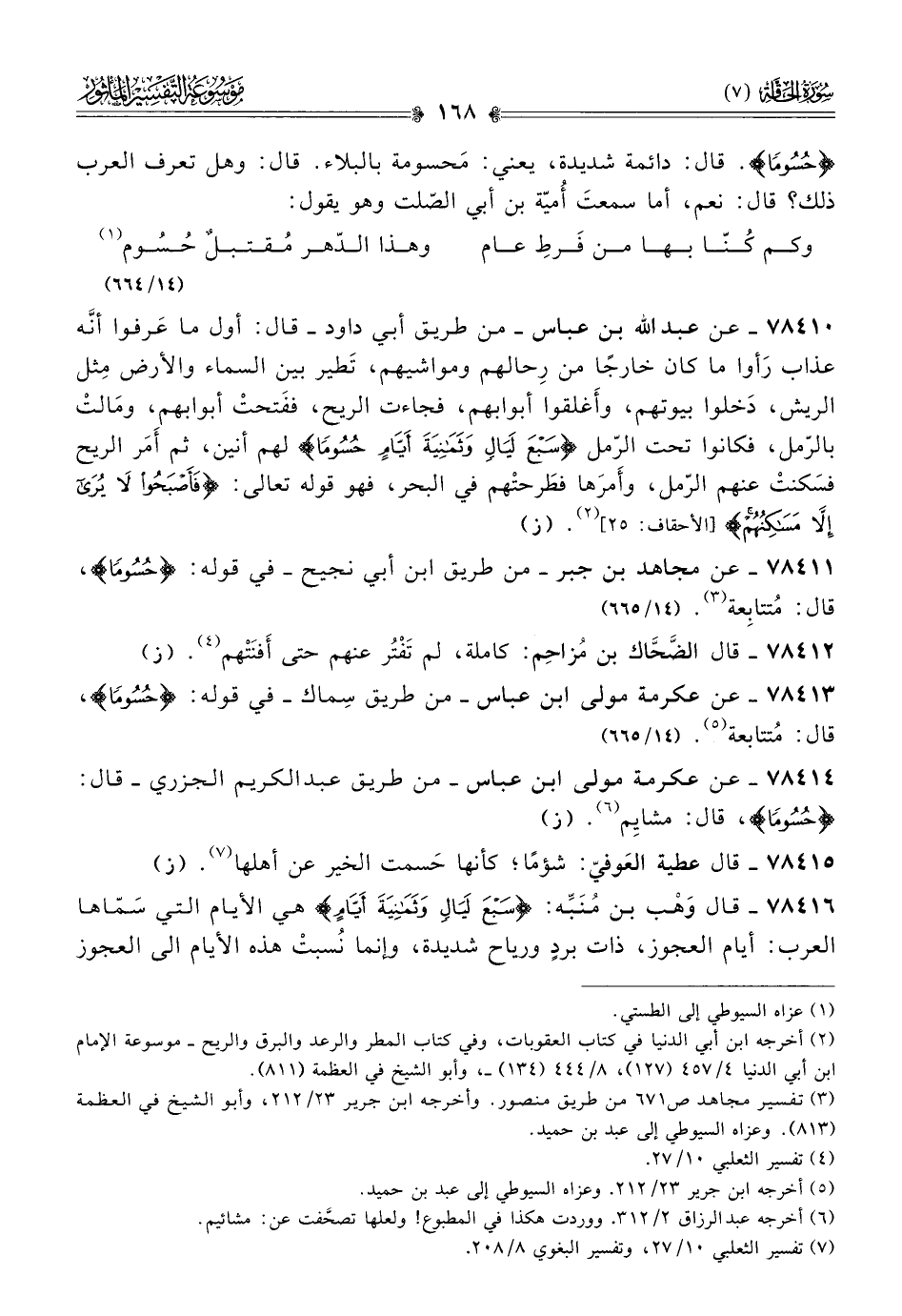 ٧٨٤١١ - عن مجاهد بن جبر -من طريق ابن أبي نجيح- في قوله: {حُسُومًا}، قال: مُتتابِعة (¬٣). (١٤/ ٦٦٥)