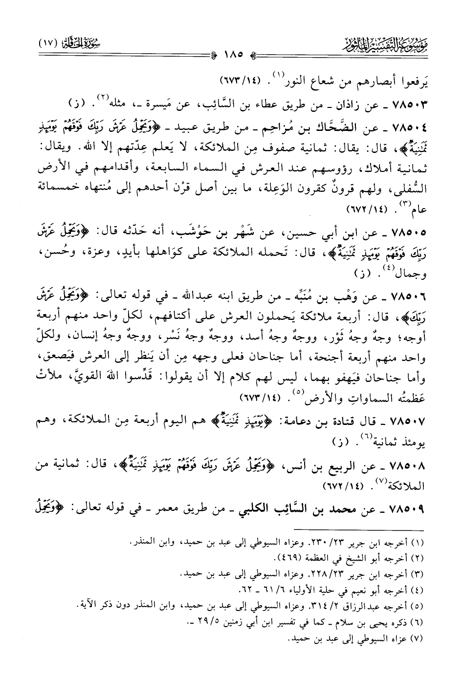 ٧٨٥٠٨ - عن الربيع بن أنس، {ويَحْمِلُ عَرْشَ رَبِّكَ فَوْقَهُمْ يَوْمَئِذٍ ثَمانِيَةٌ}، قال: ثمانية من الملائكة (¬٧). (١٤/ ٦٧٢)