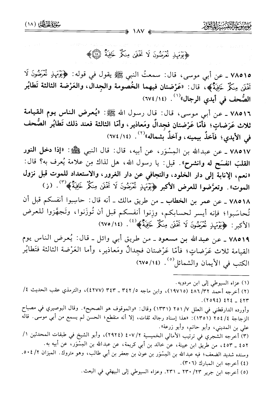 ٧٨٥١٥ - عن أبي موسى، قال: سمعتُ النبي - صلى الله عليه وسلم - يقول في قوله: {يَوْمَئِذٍ تُعْرَضُونَ لا تَخْفى مِنكُمْ خافِيَةٌ}، قال: «عَرْضتان فيهما الخُصومة والجِدال، والعَرْضة الثالثة تَطايُر الصُّحف في أيدي الرجال» (¬١). (١٤/ ٦٧٤)