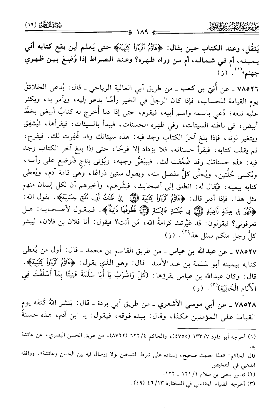 ٧٨٥٢٦ - عن أُبَيّ بن كعب -من طريق أبي العالية الرياحي- قال: يُدعى الخلائقُ يوم القيامة للحساب، فإذا كان الرجلُ في الخير رأسًا يدعو إليه، ويأمر به، ويكثر عليه تبعه؛ دُعي باسمه واسم أبيه، فيقوم، حتى إذا دنا أُخرج له كتابٌ أبيض بخطٍّ أبيض؛ في باطنه السيئات، وفي ظهره الحسنات، فيبدأ بالسيئات، فيقرأها، فيُشفِق ويتغير لونه، فإذا بلغ آخرَ الكتاب وجد فيه: هذه سيئاتك وقد غُفِرت لك. فيفرح، ثم يقلب كتابه، فيقرأ حسناته، فلا يزداد إلا فرحًا، حتى إذا بلغ آخر الكتاب وجد فيه: هذه حسناتك وقد ضُعِّفت لك. فيبيَضُّ وجهه، ويُؤتى بتاجٍ فيُوضع على رأسه، ويُكسى حُلَّتين، ويُحلّى كلُّ مفصل منه، ويطول ستين ذراعًا، وهي قامة آدم، ويُعطى كتابه بيمينه، فيُقال له: انطلق إلى أصحابك، فبشِّرهم، وأخبرهم أن لكل إنسان منهم مثل هذا. فإذا أدبر قال: {هاؤم اقرءوا كتابيه * إني ظننت أني ملاق حسابيه}. يقول الله: {فهو في عيشة راضية * في جنة عالية * قطوفها دانية}. فيقول لأصحابه: هل تعرفوني؟ فيقولون: قد غيَّرتك كرامةُ الله، مَن أنت؟ فيقول: أنا فلان بن فلان، ليبشر كلُّ رجل منكم بمثل هذا (¬٢). (ز)