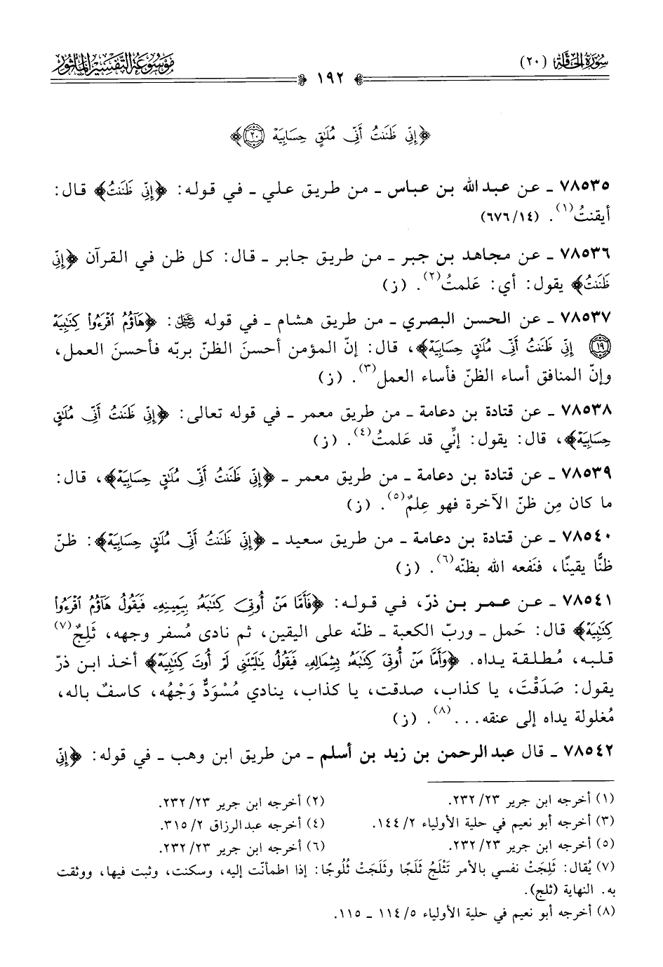 ٧٨٥٤٠ - عن قتادة بن دعامة -من طريق سعيد- {إنِّي ظَنَنْتُ أنِّي مُلاقٍ حِسابِيَهْ}: ظنّ ظنًّا يقينًا، فنَفعه الله بظنّه (¬٦). (ز)