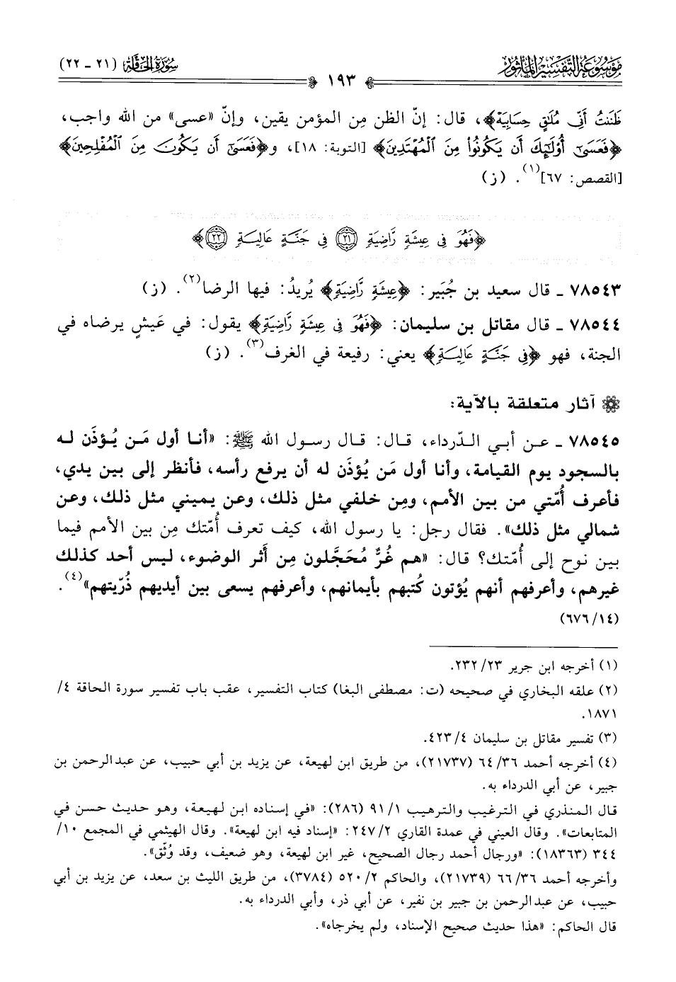 ٧٨٥٤٣ - قال سعيد بن جُبَير: {عِيشَةٍ راضِيَةٍ} يُريدُ: فيها الرضا (¬٢). (ز)