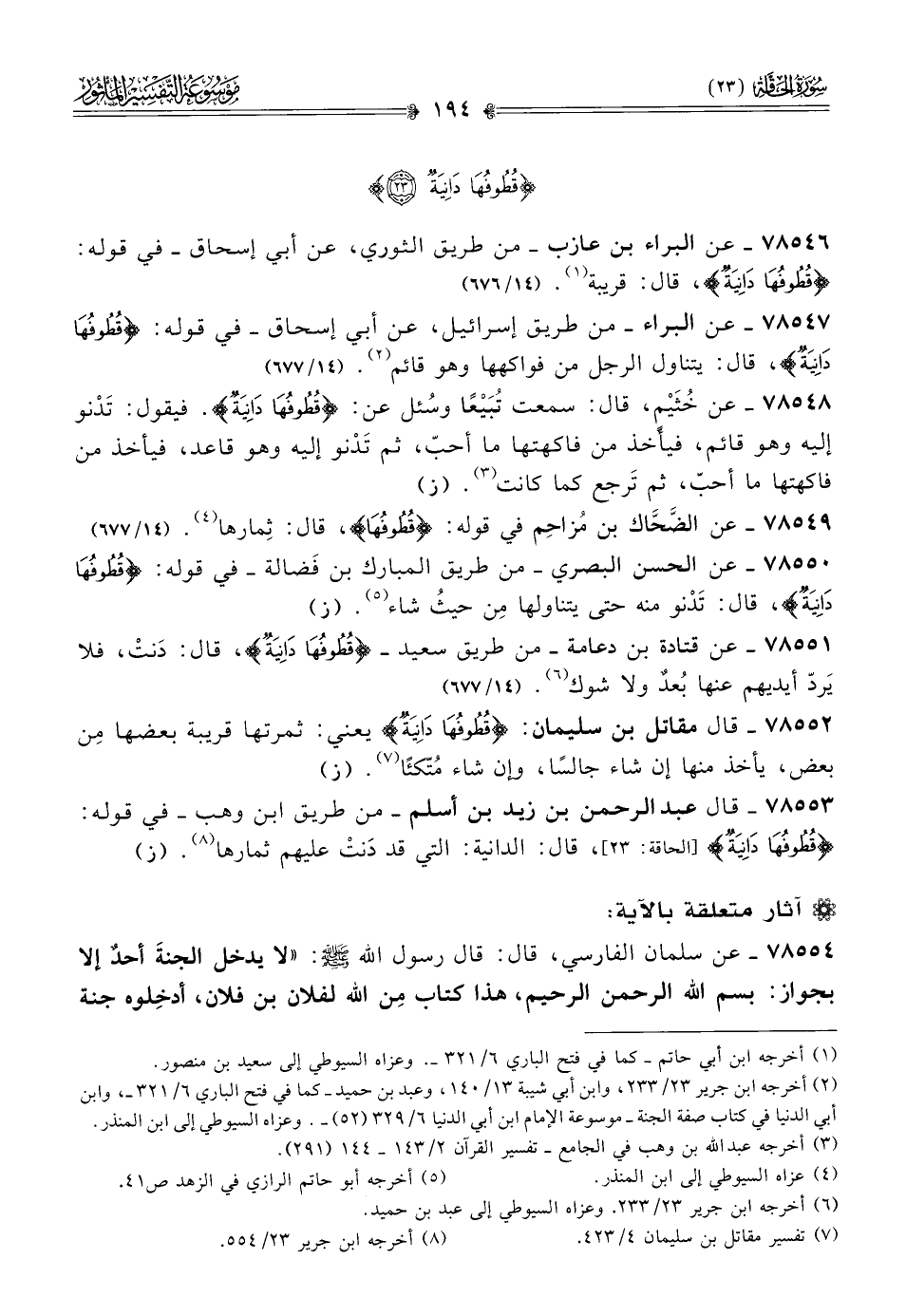 ٧٨٥٤٧ - عن البراء -من طريق إسرائيل، عن أبي إسحاق- في قوله: {قُطُوفُها دانِيَةٌ}، قال: يتناول الرجل من فواكهها وهو قائم (¬٢). (١٤/ ٦٧٦)