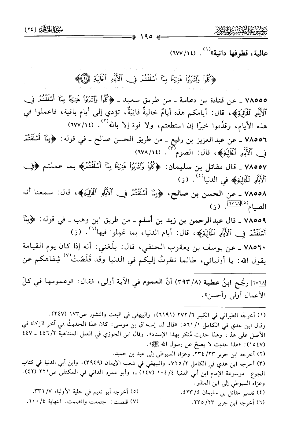 ٧٨٥٥٥ - عن قتادة بن دعامة -من طريق سعيد- {كُلُوا واشْرَبُوا هَنِيئًا بِما أسْلَفْتُمْ فِي الأَيّامِ الخالِيَةِ}، قال: أيامكم هذه أيامٌ خاليةٌ فانِيَةٌ، تؤدي إلى أيام باقية، فاعملوا في هذه الأيام، وقدِّموا خيرًا إن استطعتم، ولا قوة إلا بالله (¬٢). (١٤/ ٦٧٧)