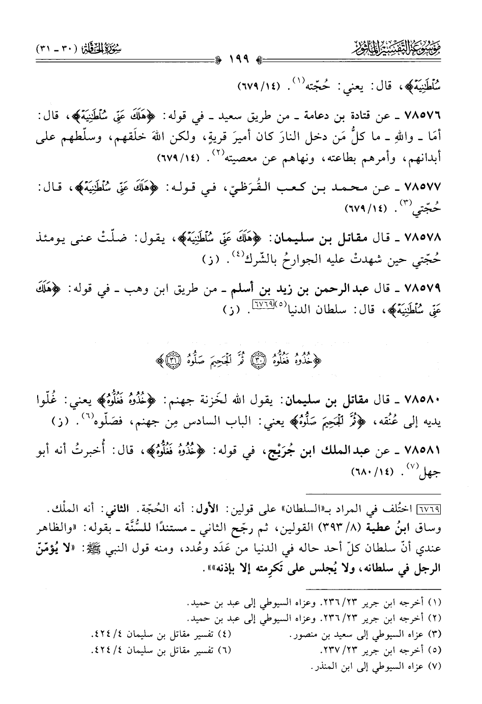 ٧٨٥٧٦ - عن قتادة بن دعامة -من طريق سعيد- في قوله: {هَلَكَ عَنِّي سُلْطانِيَهْ}، قال: أما -واللهِ- ما كلُّ مَن دخل النارَ كان أميرَ قريةٍ، ولكن اللهَ خلَقهم، وسلّطهم على أبدانهم، وأمرهم بطاعته، ونهاهم عن معصيته (¬٢). (١٤/ ٦٧٩)