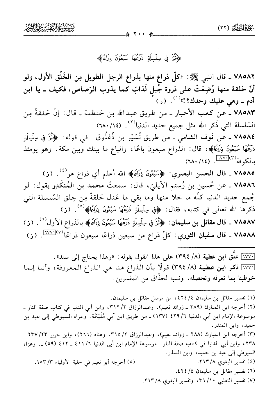 ٧٨٥٨٧ - قال مقاتل بن سليمان: {ثُمَّ فِي سِلْسِلَةٍ ذَرْعُها سَبْعُونَ ذِراعًا} بالذراع الأول (¬٦). (ز)