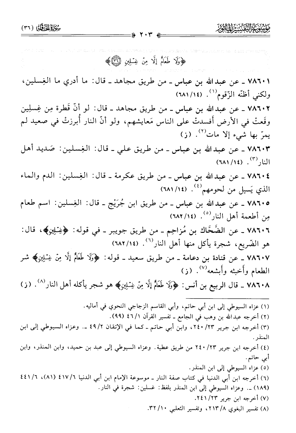 (¬٦) أخرجه ابن أبي الدنيا في كتاب صفة النار -موسوعة الإمام ابن أبي الدنيا ٦/ ٤١٧ (٨١)، ٦/ ٤٤١ (١٨٩) -. وعزاه السيوطي إلى ابن المنذر بلفظ: غسلين: شجرة في النار.