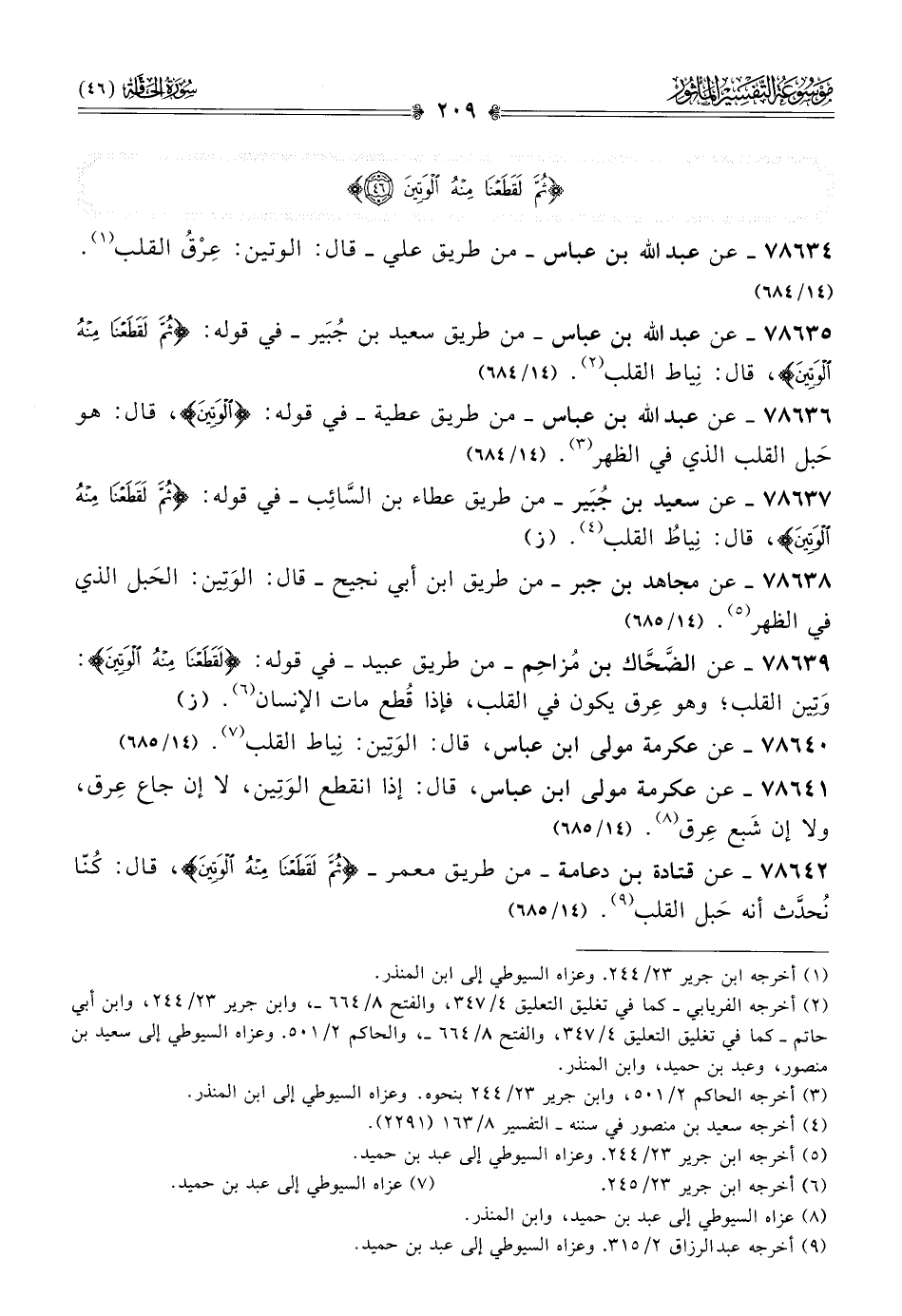 ٧٨٦٣٥ - عن عبد الله بن عباس -من طريق سعيد بن جُبَير- في قوله: {ثُمَّ لَقَطَعْنا مِنهُ الوَتِينَ}، قال: نِياط القلب (¬٢). (١٤/ ٦٨٤)
