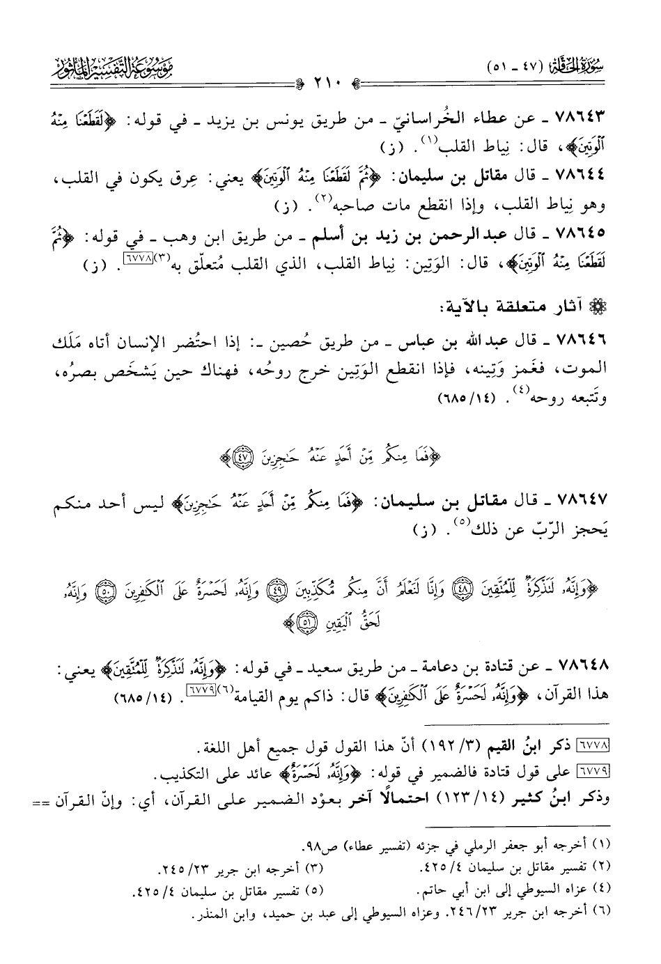 ٧٨٦٤٥ - قال عبد الرحمن بن زيد بن أسلم -من طريق ابن وهب- في قوله: {ثُمَّ لَقَطَعْنا مِنهُ الوَتِينَ}، قال: الوَتِين: نِياط القلب، الذي القلب مُتعلّق به (¬٣) [٦٧٧٨]. (ز)