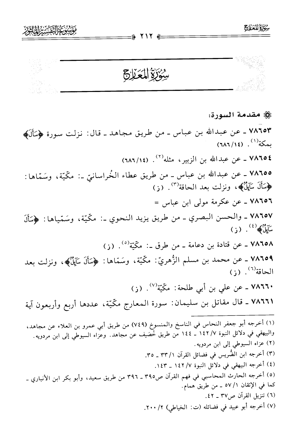 ٧٨٦٥٣ - عن عبد الله بن عباس -من طريق مجاهد- قال: نزلت سورة {سأل} بمكة (¬١). (١٤/ ٦٨٦)