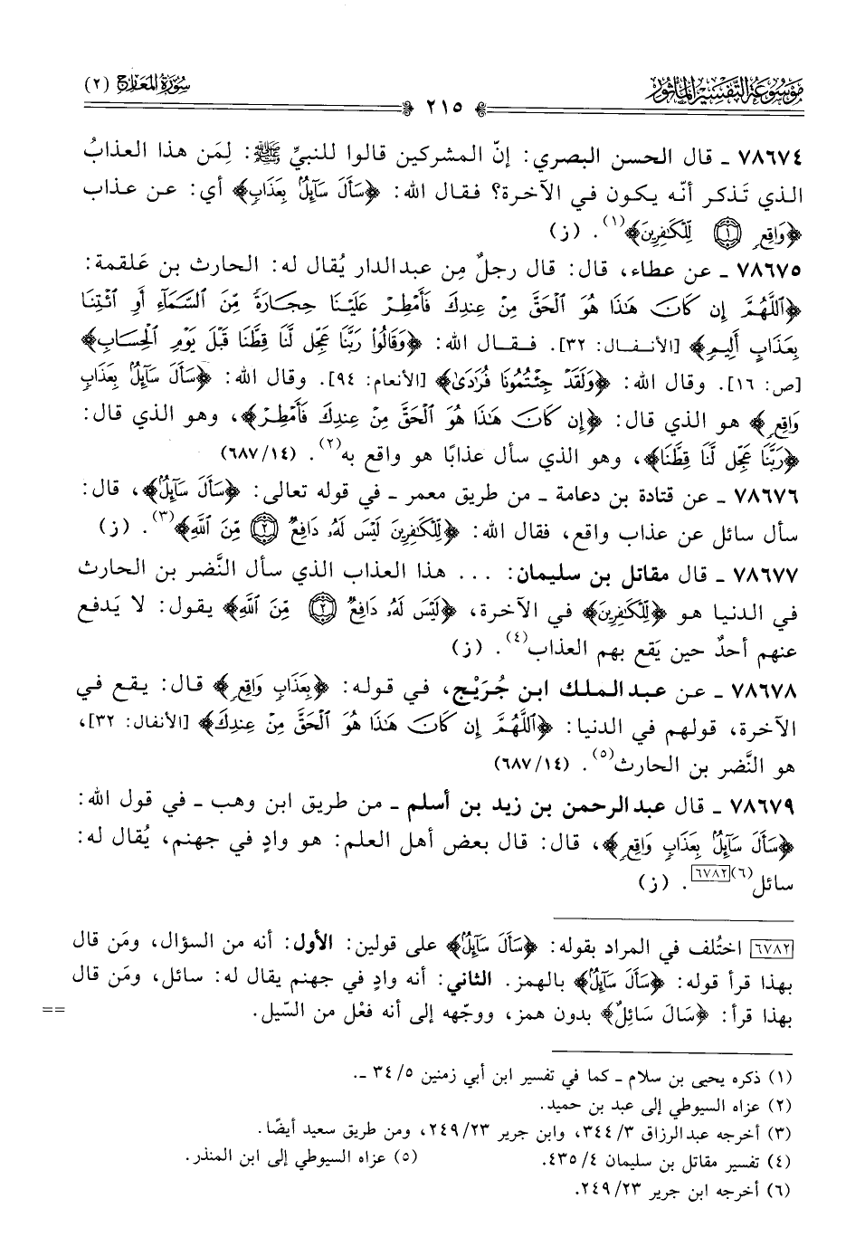 ٧٨٦٧٩ - قال عبد الرحمن بن زيد بن أسلم -من طريق ابن وهب- في قول الله: {سَأَلَ سائِلٌ بِعَذابٍ واقِعٍ}، قال: قال بعض أهل العلم: هو وادٍ في جهنم، يُقال له: سائل (¬٦) [٦٧٨٢]. (ز)