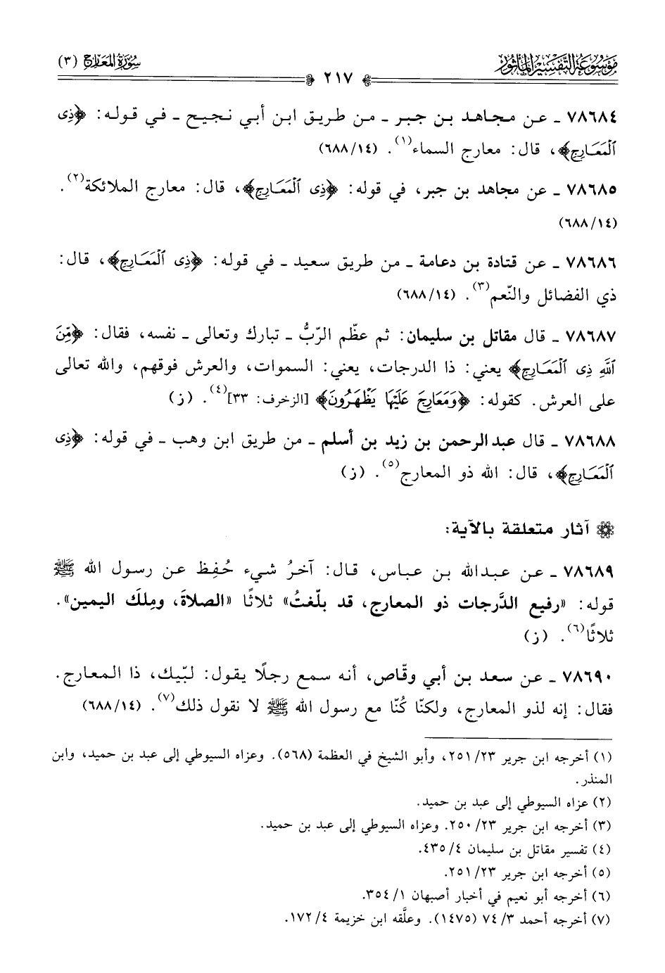 ٧٨٦٨٦ - عن قتادة بن دعامة -من طريق سعيد- في قوله: {ذِي المَعارِجِ}، قال: ذي الفضائل والنّعم (¬٣). (١٤/ ٦٨٨)