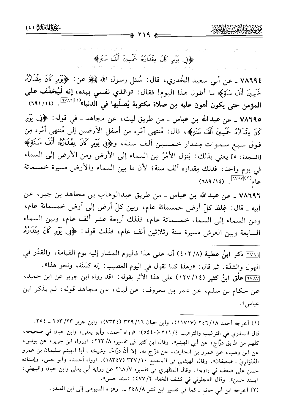 ٧٨٦٩٤ - عن أبي سعيد الخُدري، قال: سُئل رسول الله - صلى الله عليه وسلم - عن: {يَوْمٍ كانَ مِقْدارُهُ خَمْسِينَ ألْفَ سَنَةٍ} ما أطول هذا اليوم! فقال: «والذي نفسي بيده، إنه لَيُخفّف على المؤمن حتى يكون أهون عليه مِن صلاة مكتوبة يُصلّيها في الدنيا» (¬١) [٦٧٨٦]. (١٤/ ٦٩١)