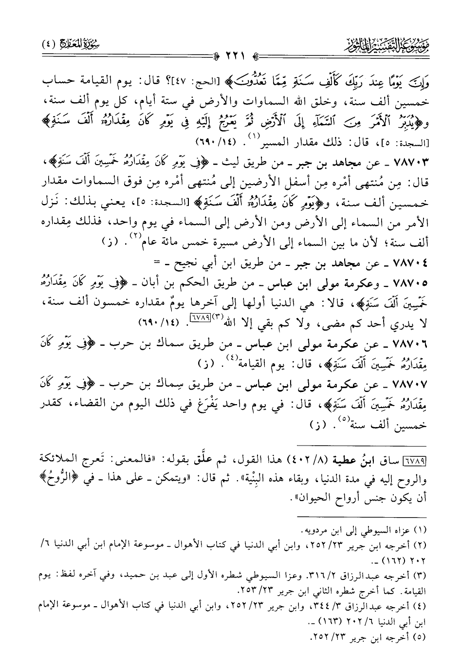 ٧٨٧٠٥ - وعكرمة مولى ابن عباس -من طريق الحكم بن أبان- {فِي يَوْمٍ كانَ مِقْدارُهُ خَمْسِينَ ألْفَ سَنَةٍ}، قالا: هي الدنيا أولها إلى آخرها يومٌ مقداره خمسون ألف سنة، لا يدري أحد كم مضى، ولا كم بقي إلا الله (¬٣) [٦٧٨٩]. (١٤/ ٦٩٠)