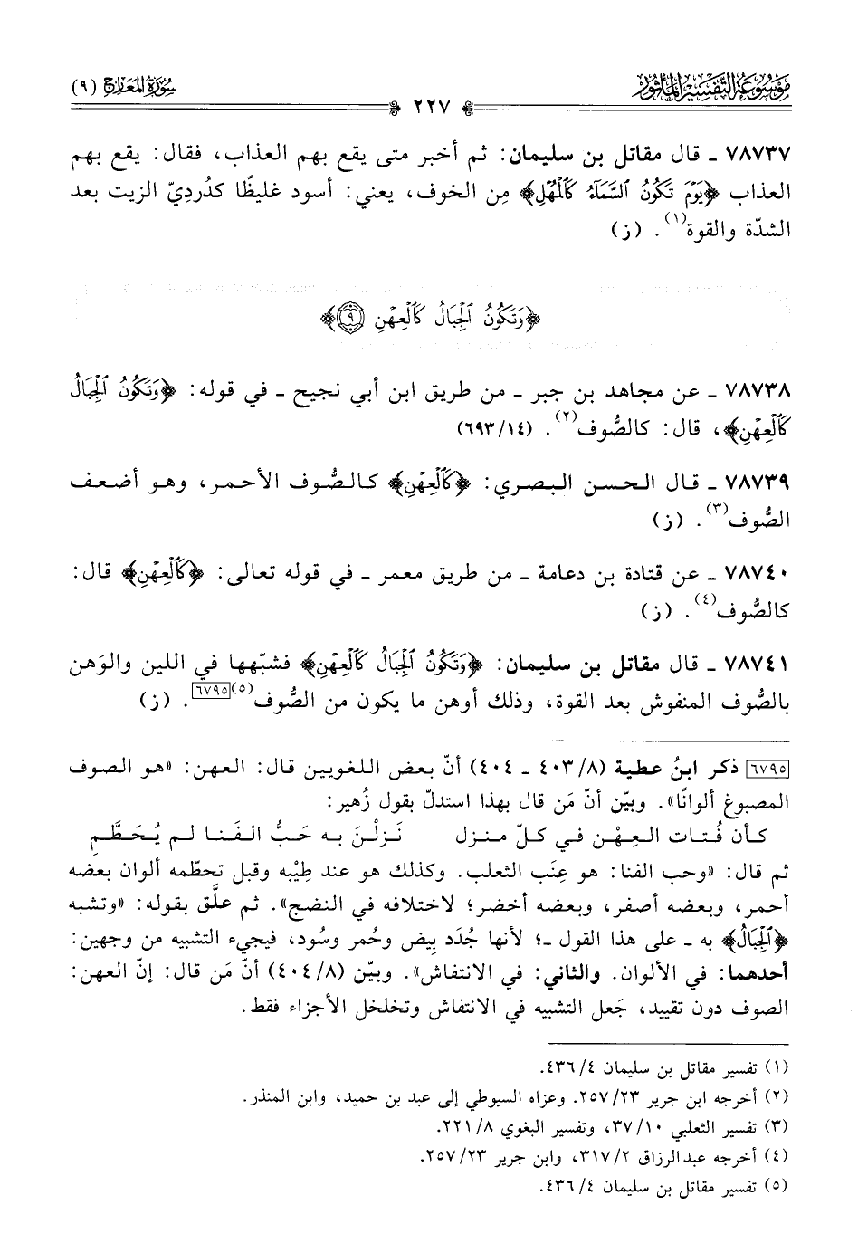 ٧٨٧٣٨ - عن مجاهد بن جبر -من طريق ابن أبي نجيح- في قوله: {وتَكُونُ الجِبالُ كالعِهْنِ}، قال: كالصُّوف (¬٢). (١٤/ ٦٩٣)