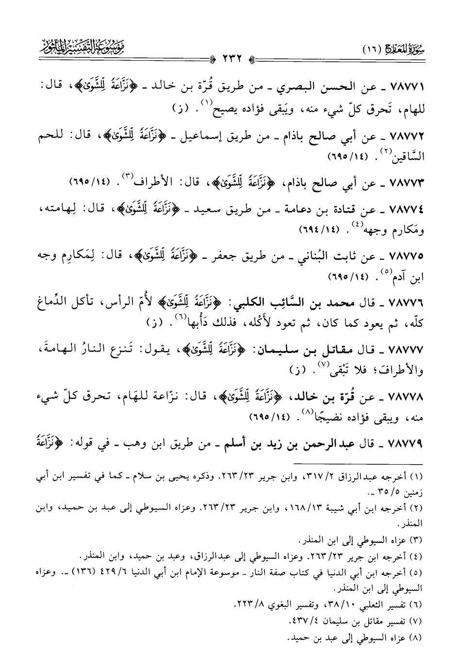 ٧٨٧٧٢ - عن أبي صالح باذام -من طريق إسماعيل- {نَزّاعَةً لِلشَّوى}، قال: للحم السّاقين (¬٢). (١٤/ ٦٩٥)