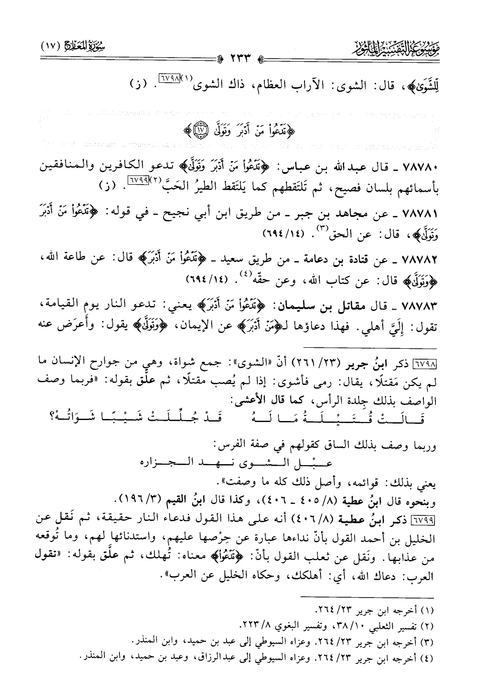 ٧٨٧٨٢ - عن قتادة بن دعامة -من طريق سعيد- {تَدْعُو مَن أدْبَرَ} قال: عن طاعة الله، {وتَوَلّى} قال: عن كتاب الله، وعن حقّه (¬٤). (١٤/ ٦٩٤)
