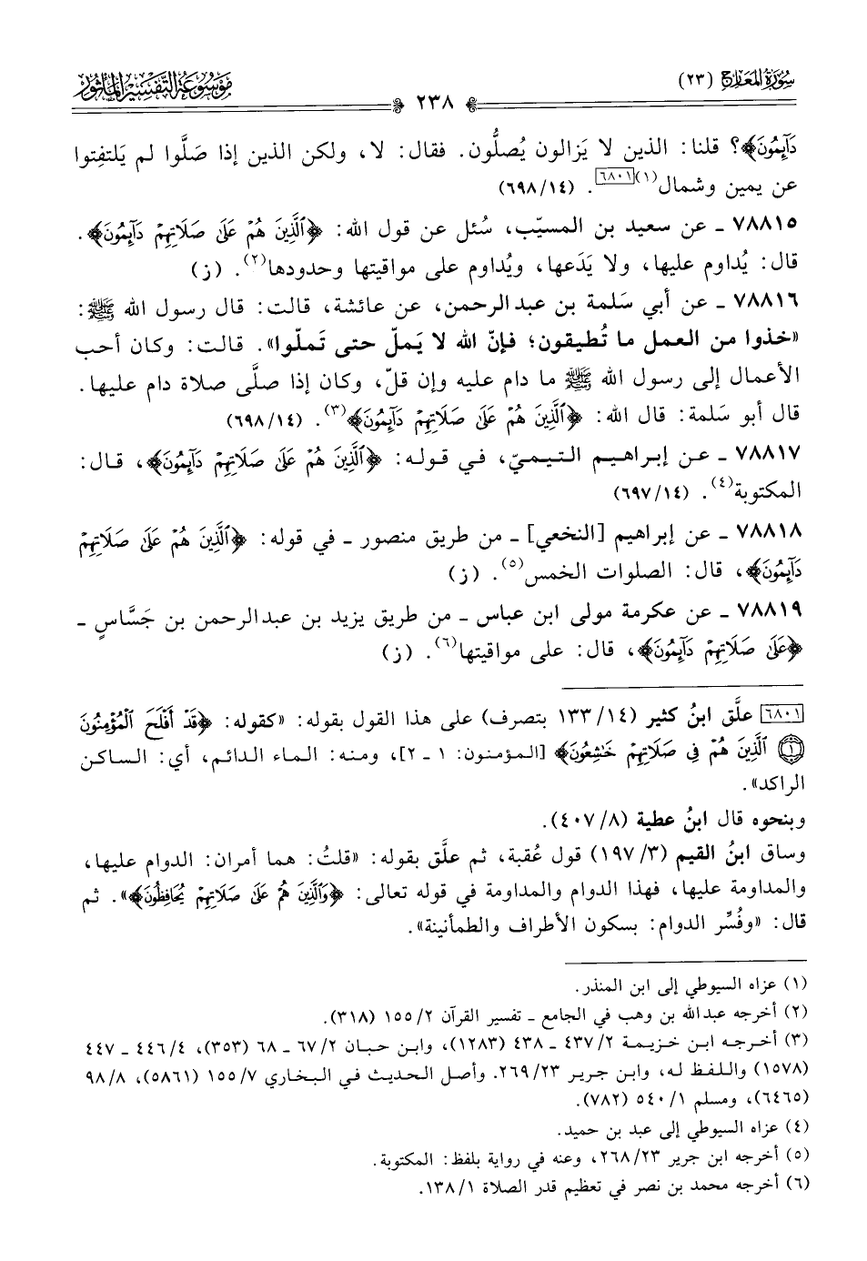 ٧٨٨١٧ - عن إبراهيم التيميّ، في قوله: {الَّذِينَ هُمْ عَلى صَلاتِهِمْ دائِمُونَ}، قال: المكتوبة (¬٤). (١٤/ ٦٩٧)